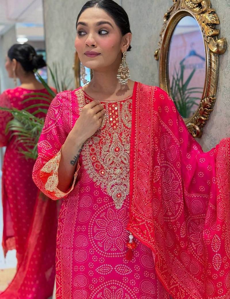 | Product Name | Pink & Red Bandhani Print Crepe Kurta Set With Embroidered Neckline | |