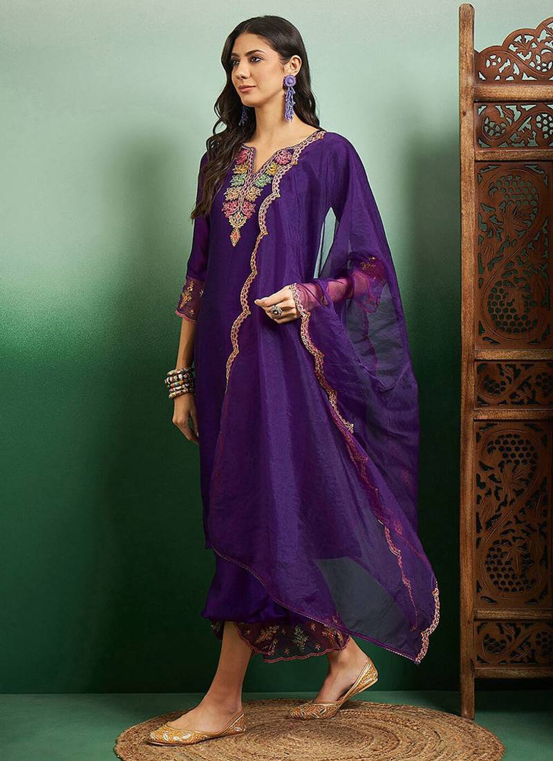 | Product Description | Elegant And Festive, This Purple Kurta Set Is Crafted In Smooth Chanderi Fabric, Perfect For Pooja And Celebratory Occasions. The Kurta Features Traditional Organza Enhanced With Delicate Embroidery At The Neckline, Adding Subtle Shimmer And Intricate Detailing. |