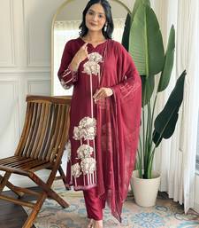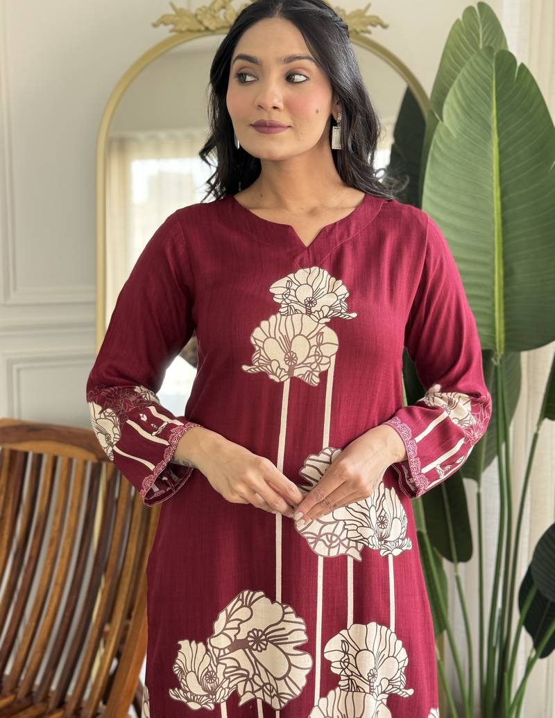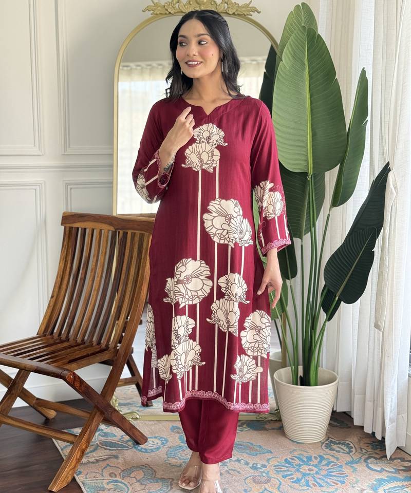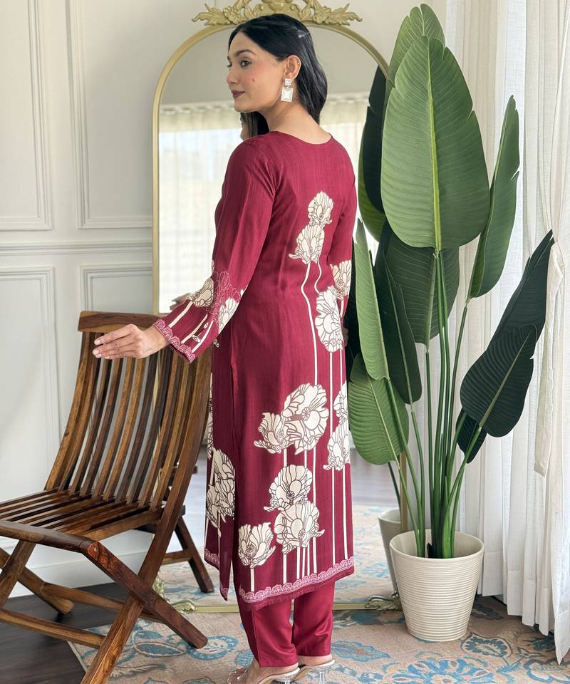Rani pink floral printed viscose rayon kurta with trousers & dupatta stitched