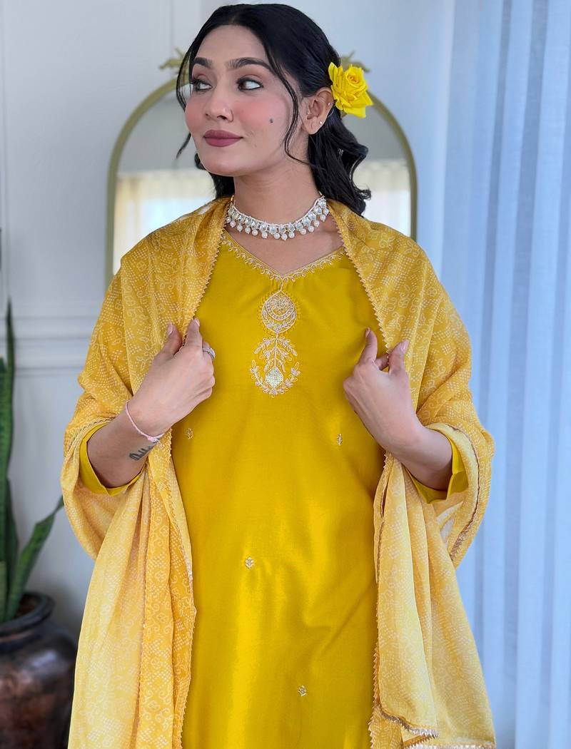 | • | Dupatta | : | Color- Mustard / Fabric- Silk Blend |