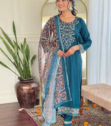Teal blue color chanderi silk kurta set stitched