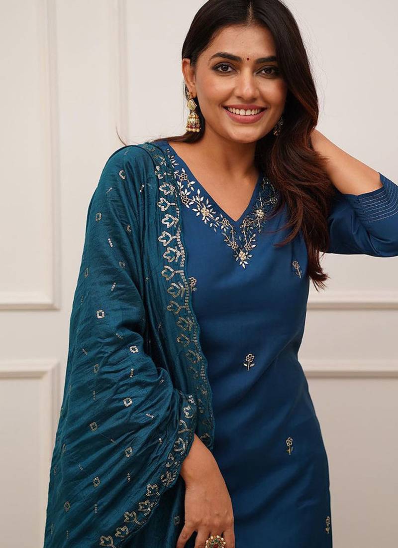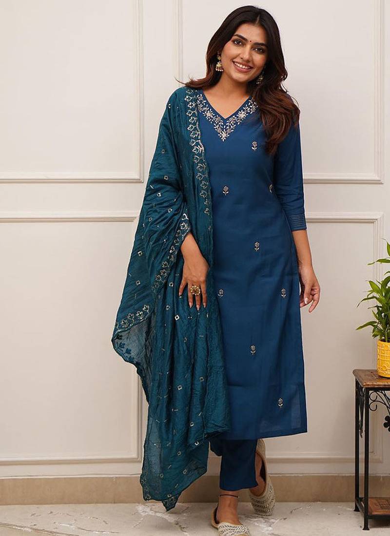 | Product Description | This Teal Blue Kurta Set In Chanderi Viscose Fabric Exudes Quiet Elegance, Making It A Timeless Pick For Festive Gatherings. The Kurta Is Paired With Matching Straight Pants And A Sheer Chanderi Dupatta, All Subtly Enhanced With Embroidery For A Refined Finish. A Perfect Blend Of Comfort And Sophistication For Graceful Occasions. |