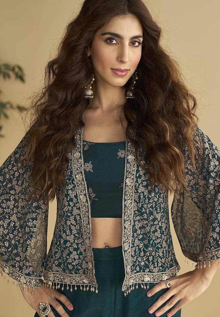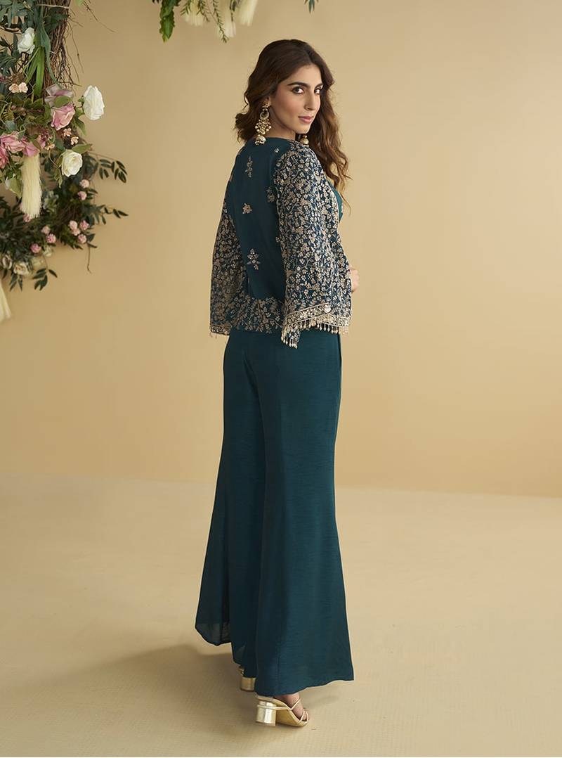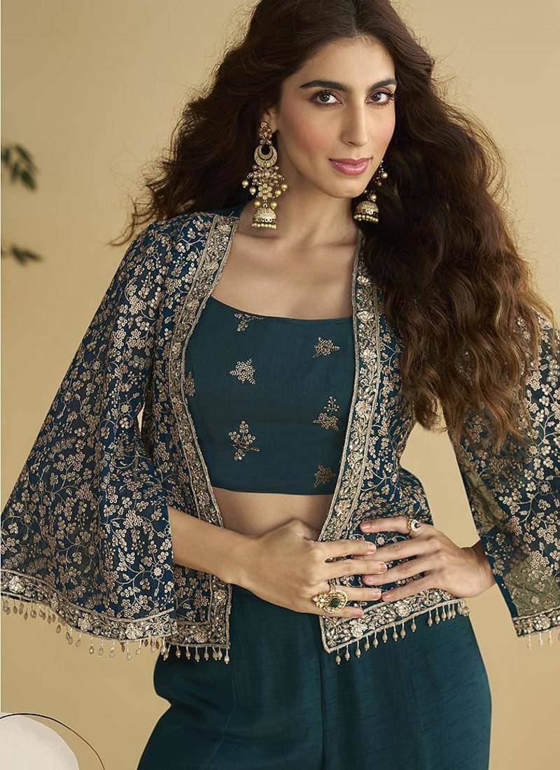 Teal embroidered silk designer jacket style indowestern semi stitched up to 42" size