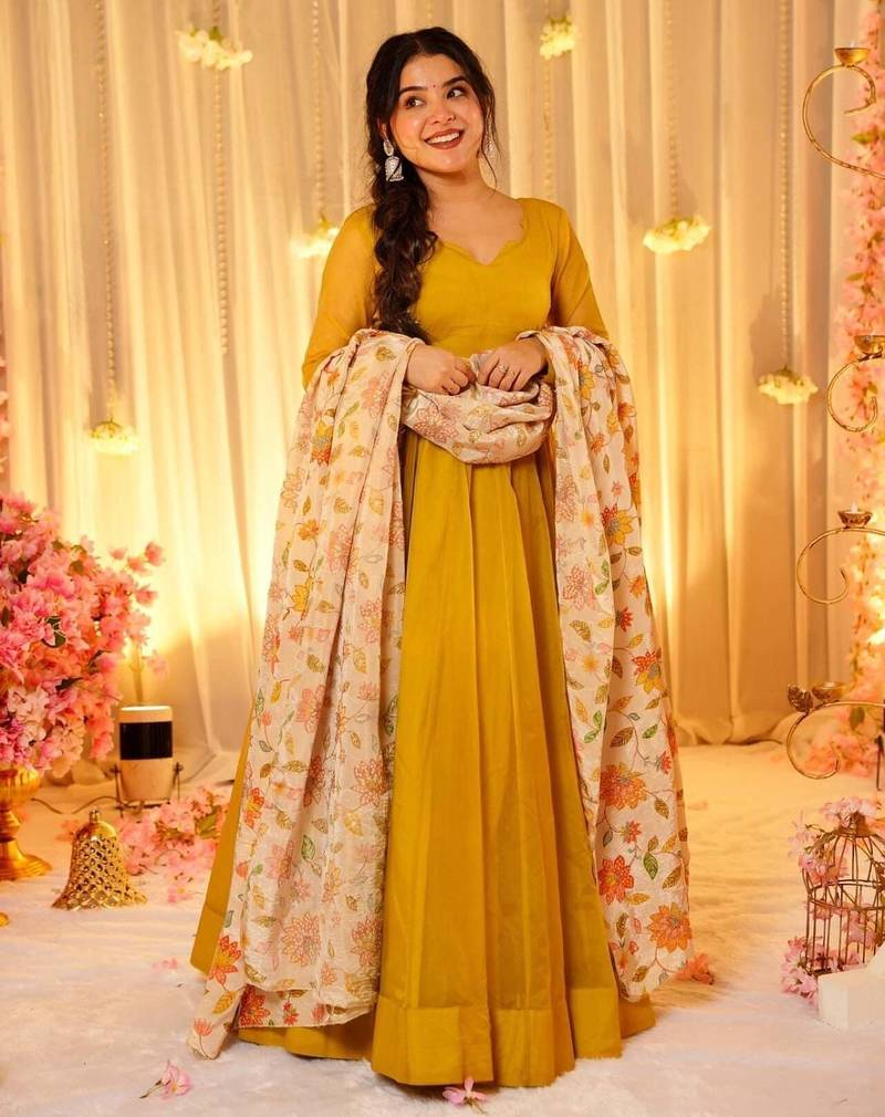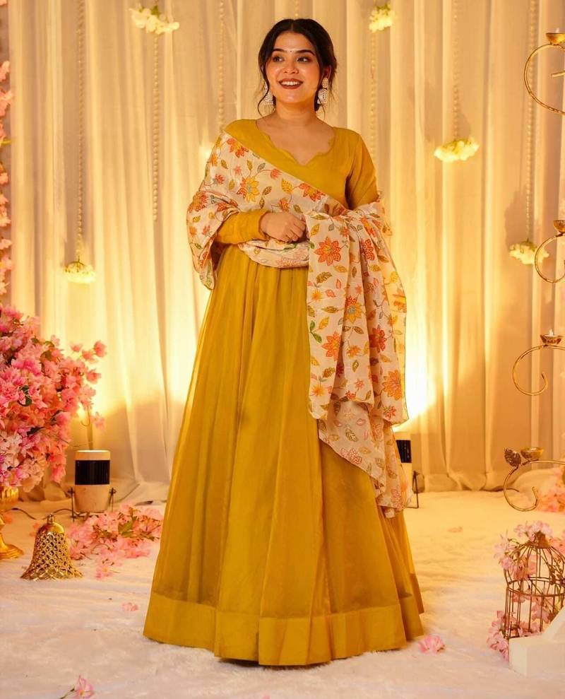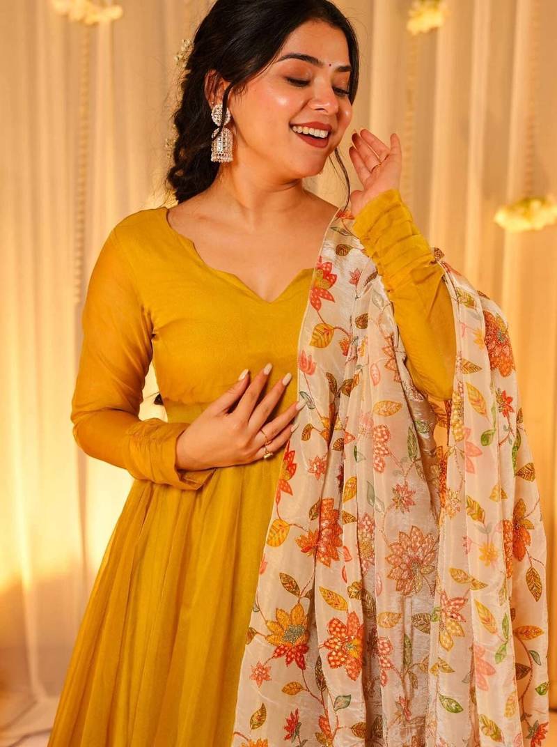 | Product Description | Grace Your Festive Moments With This Stunning Mustard Yellow Anarkali Gown, Crafted In A Rich, Tebby Silk Fabric For A Regal Silhouette. The Outfit Is Paired With A Beautifully Embroidered Cream Dupatta Adorned With Vibrant Floral Motifs And Delicate Tassel Detailing. Perfect For Weddings, Sangeet Nights, Or Special Celebrations, This Ensemble Blends Traditional Charm With Modern Elegance. Style It With Statement Earrings And A Braided Hairstyle To Complete The Look. |