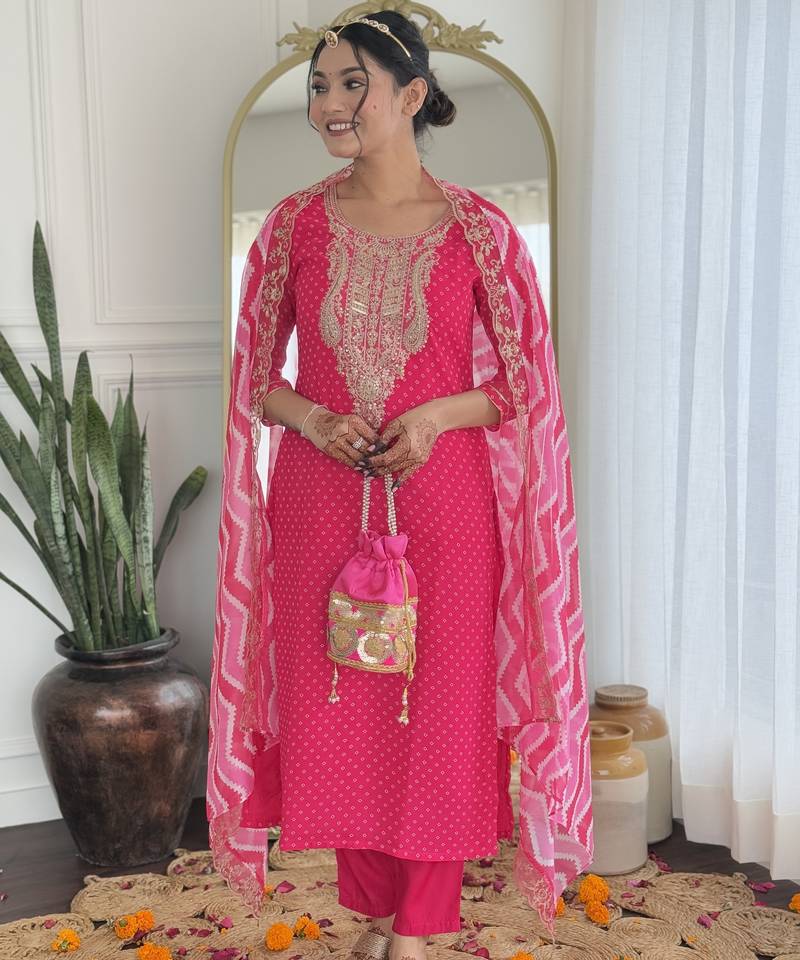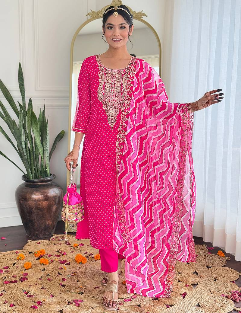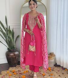 Vichitra silk embroidered straight salwar kameez in rani pink stitched