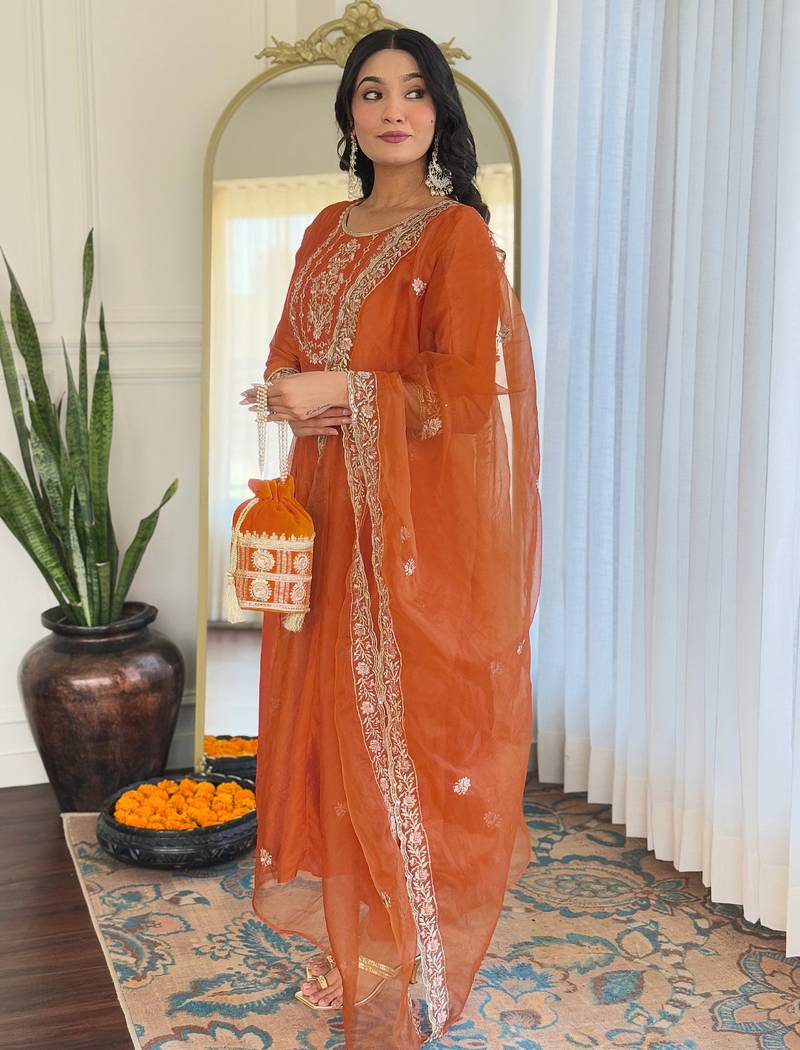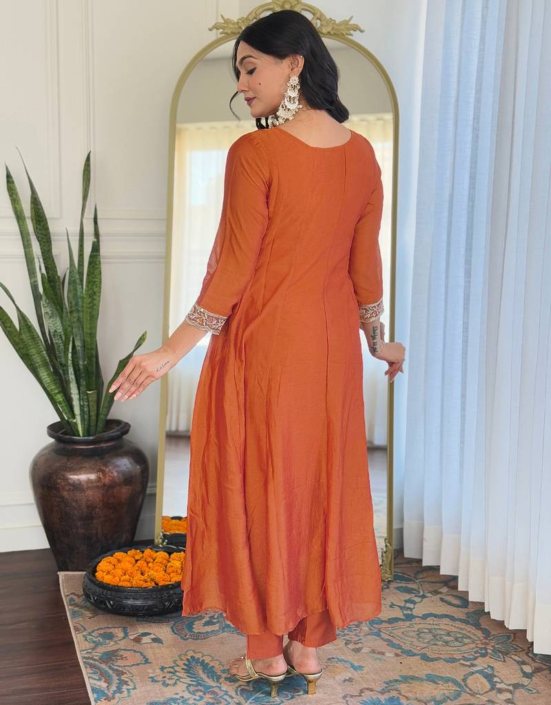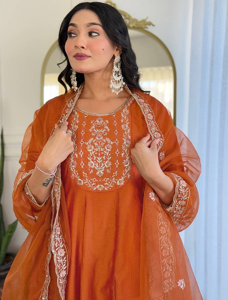 Vichitra silk rust embroidered salwar kameez stitched