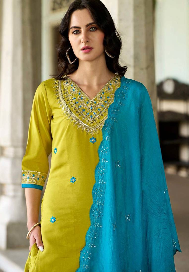 | Product Name | Viscose Chanderi Green And Mustard Embroidered Trendy Salwar Kameez | |