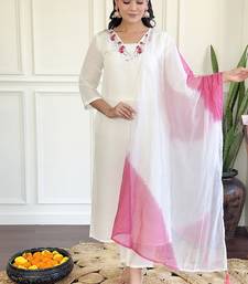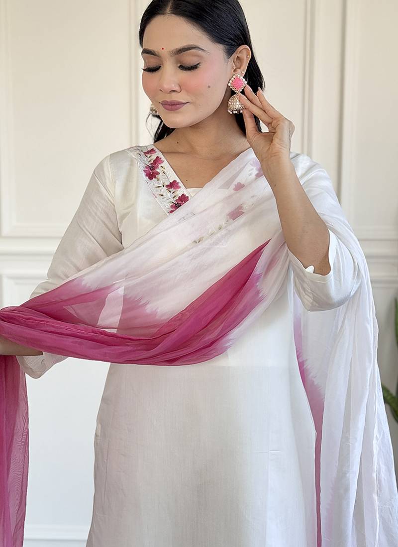 This White Kurta Set In Chanderi Fabric Exudes Quiet Elegance, Making It A Timeless Pick For Festive Gatherings. The Kurta Is Paired With Matching Straight Pants And A Nylon Dupatta