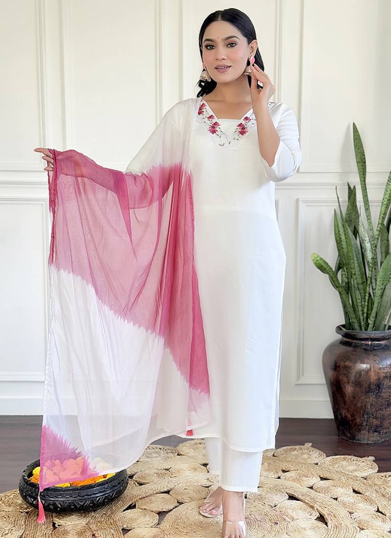Product Name White Color Chanderi Viscose Sttiched Kurta Set