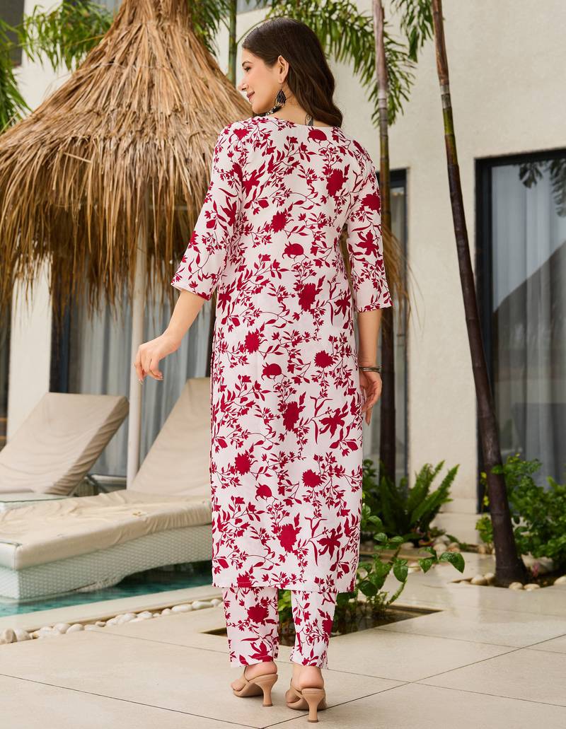 White & pink silk blend floral printed kurta pant set with dupatta for festive wear stitched
