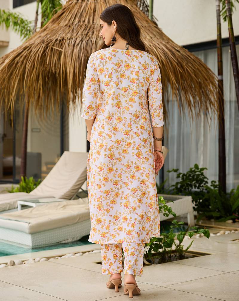 White & yellow silk blend floral printed kurta pant set with dupatta for festive wear stitched
