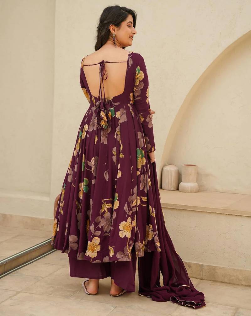 Wine printed rayon anarkali kurta palazzo set stitched
