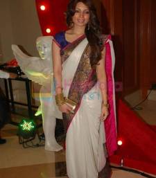 | Product Description | White Shimmer Georgette Saree With Brocade Border And Pink Raw Silk Border With Blue Raw Silk Blouse. |