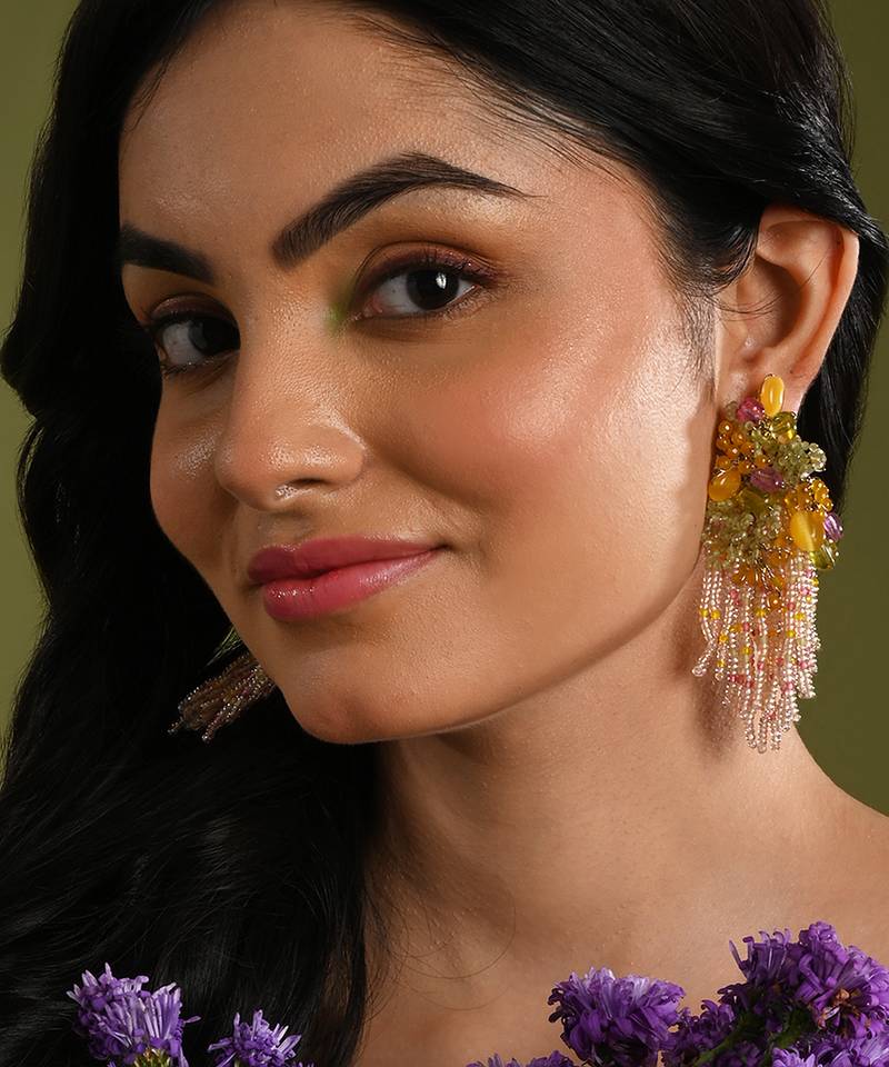 | Product Description | Handcrafted Multicolored Long Earrings With Vibrant Beads In Pink, Yellow, Green, And Orange Tones. Featuring Cascading Strands And Statement Detailing, They Add A Playful Yet Elegant Touch To Festive, Wedding, And Party Looks. Perfect To Style With Both Traditional And Modern Outfits For A Bold Pop Of Color. |