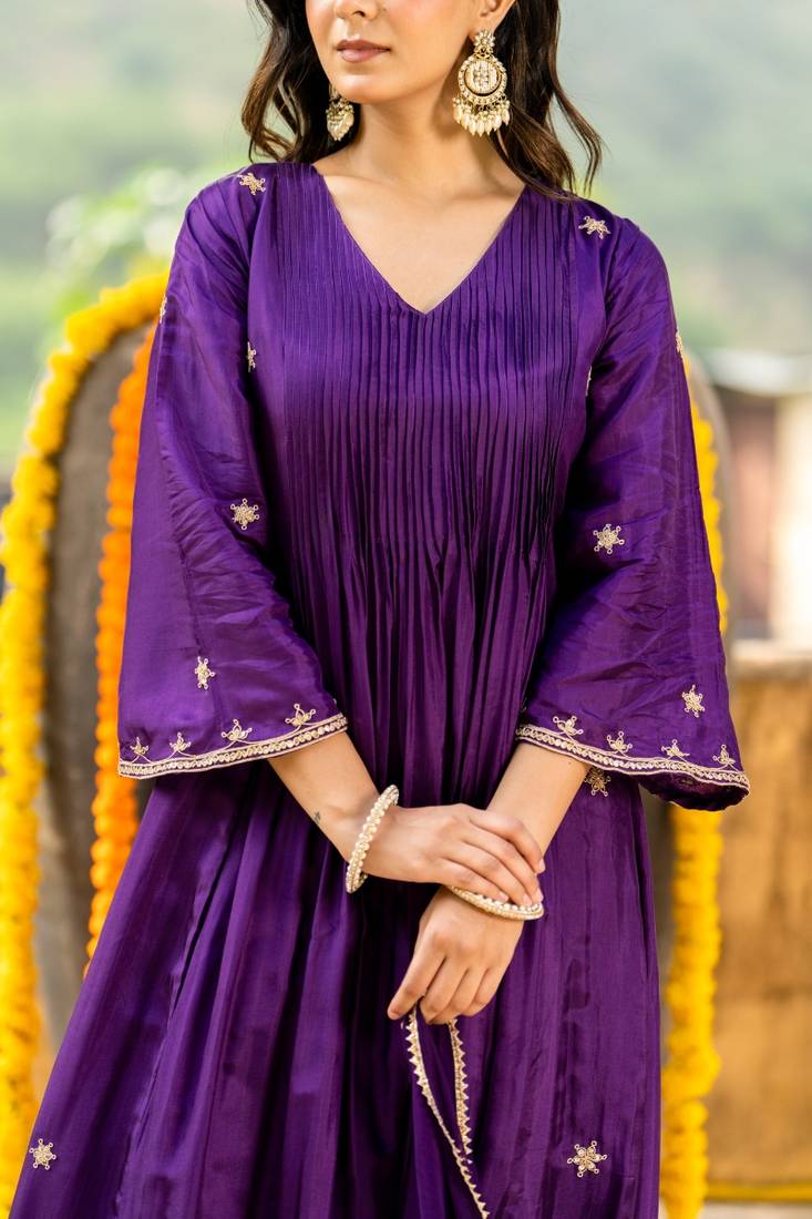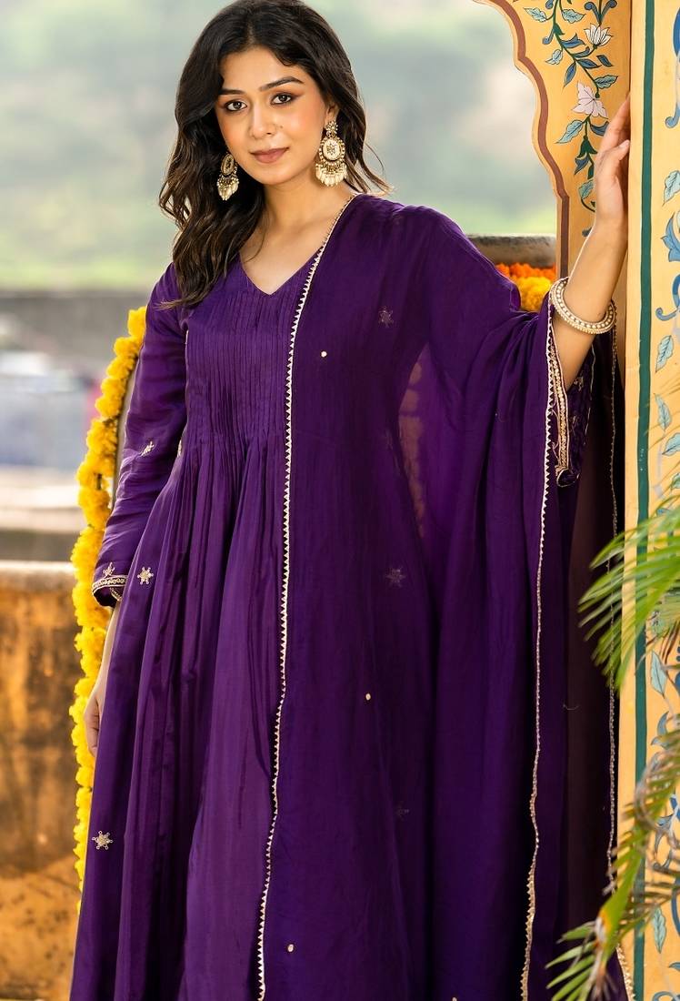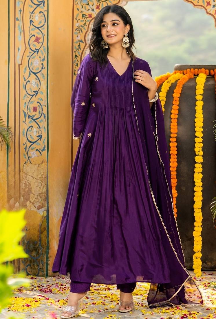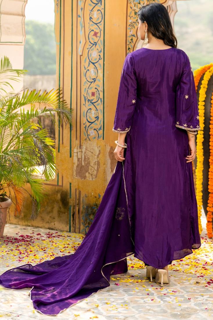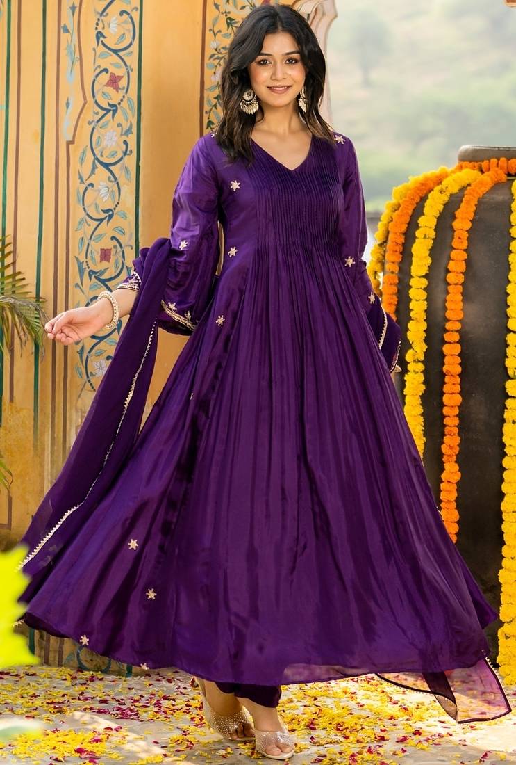 | Product Name | Dark Purple Silk Embroidered Zari Work Anarkali With Pant And Dupatta Set | |