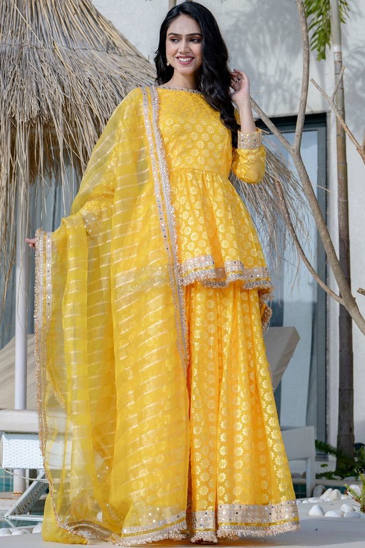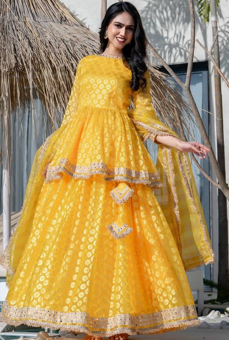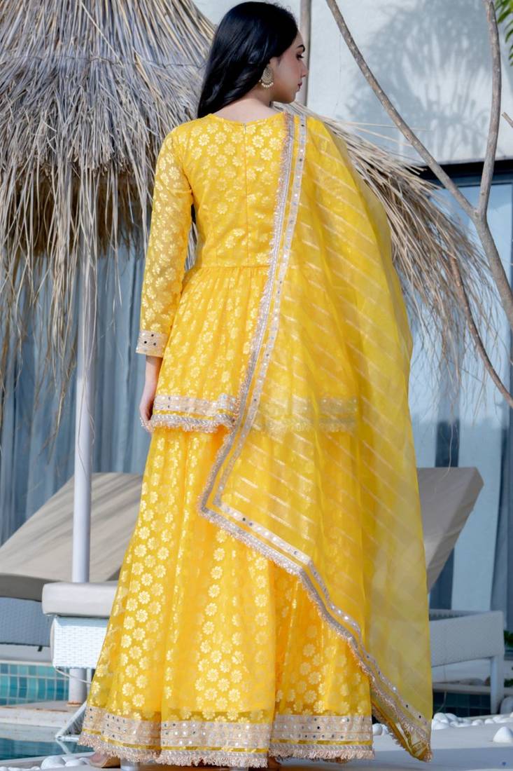 | Product Name | Yellow Brasso Mirror Lace Work Kurta Skirt And Dupatta | |