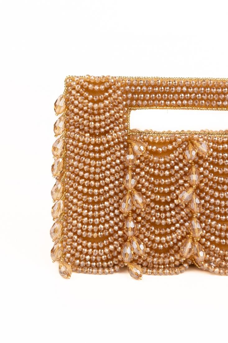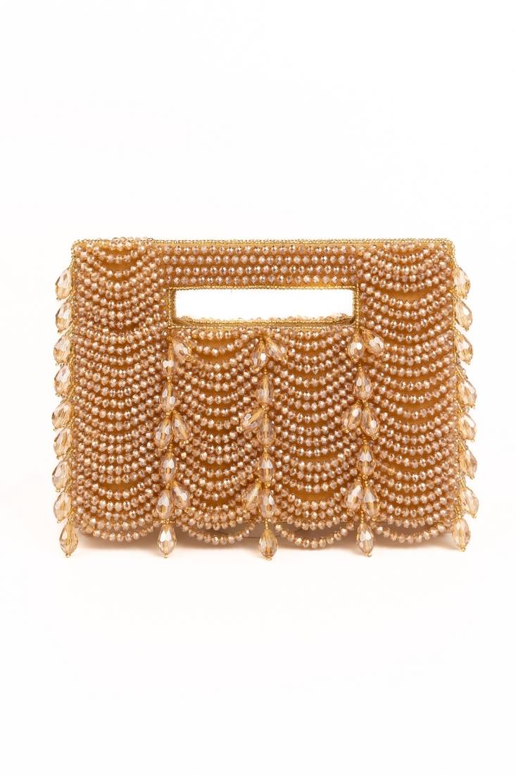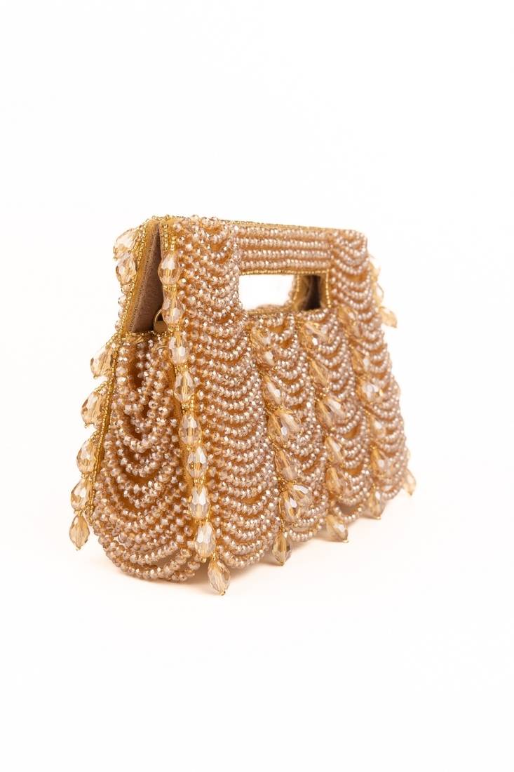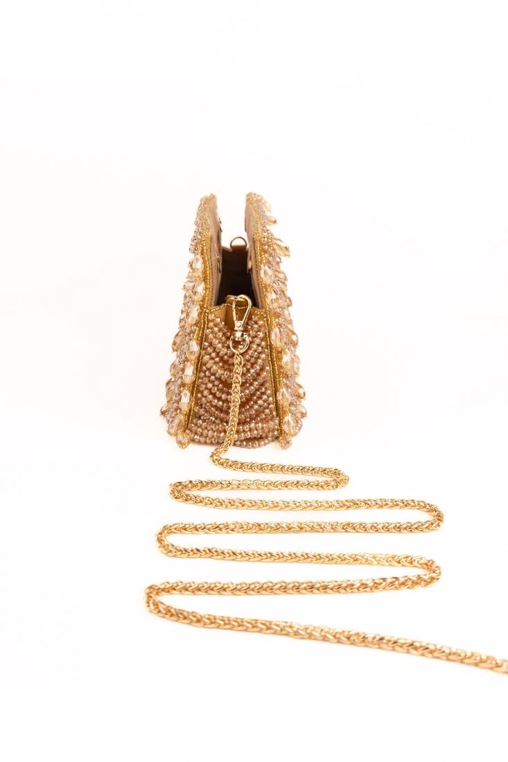 | Product Description | Luxurious, Radiant, And Timeless — The Amyra Gold Suede Handcrafted Clutch Is Crafted To Shine. Finished In Luxurious Gold/Beige Suede, This Structured Silhouette Is Adorned With Detailed Crystal Embroidery And Elegant Fringe Accents That Create Fluid Movement. Designed To Fit Your Everyday Essentials, It Offers Both Glamour And Functionality. The Detachable Chain Strap Adds Versatile Styling Options, Making It Perfect For Weddings And Festive Celebrations.