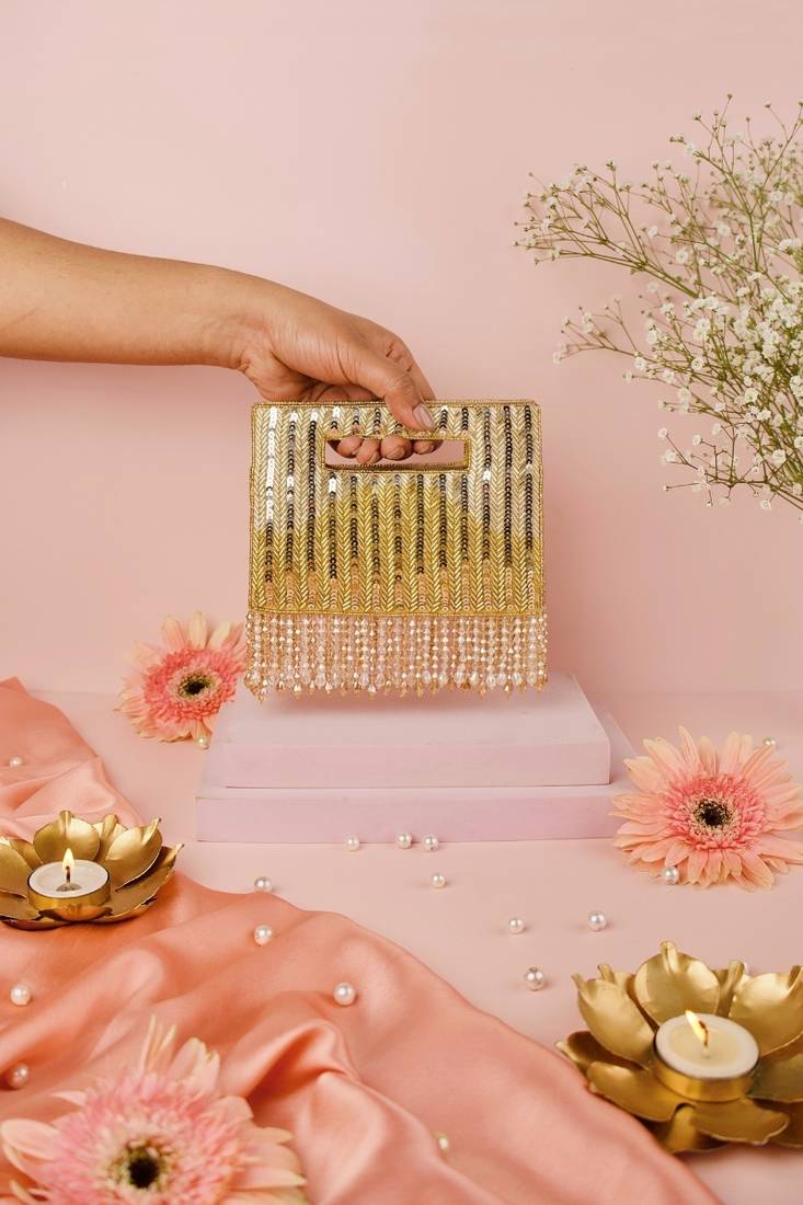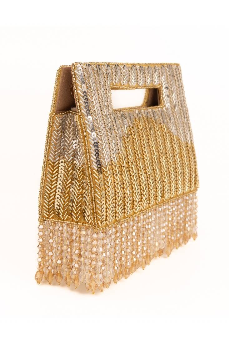 | Product Description | Sleek, Glamorous, And Couture Inspired — The Ayla Gold & Silver Embellished Clutch Is Crafted For High Impact Styling. Designed With Metallic Toned Sequin On Suede Fabric, This Structured Clutch Is Adorned With Intricate Sequin Embroidery And Cascading Crystals Embellishment Tassels Detailing That Adds Dramatic Movement. Designed To Fit Your Everyday Essentials, It Blends Statement Design With Functional Elegance. The Refined Silhouette Makes It Perfect For Evening Events And Festive Celebrations.