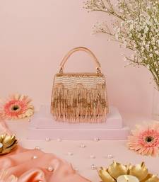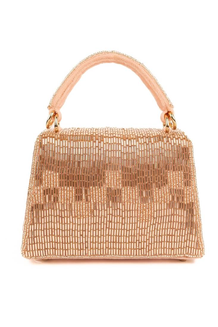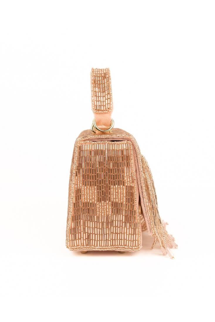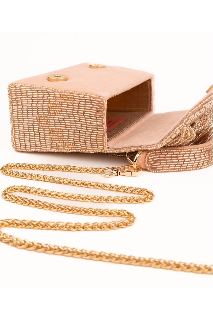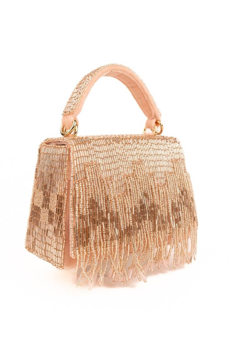 Delicate, Luminous, And Crafted To Shine — The Bushra Rose Gold Suede Handcrafted Box Bag Embodies Timeless Opulence. Finished In Radiant Baby Pink Suede, This Structured Silhouette Is Enhanced With Shimmering Beadwork And Cascading Fringe Details That Reflect Light Beautifully. Designed For Occasions When You Want To Carry Just The Essentials, This Compact Box Bag Does Not Fit A Phone But Is Perfect For Cards, Cash, Keys, And Touch Up Makeup. The Detachable Chain And The Sculpted Handle Adds Strength And Makes It Functional. Perfect For Weddings, Festive Soirées, And Statement Styling, This Handcrafted Piece Brings Timeless Glamour With A Modern Edge. Product Colour May Slightly Vary Due To Photographic Lighting Sources Or Your Monitor Settings.