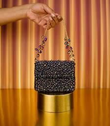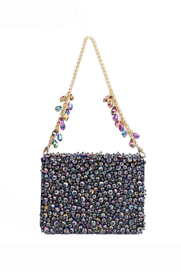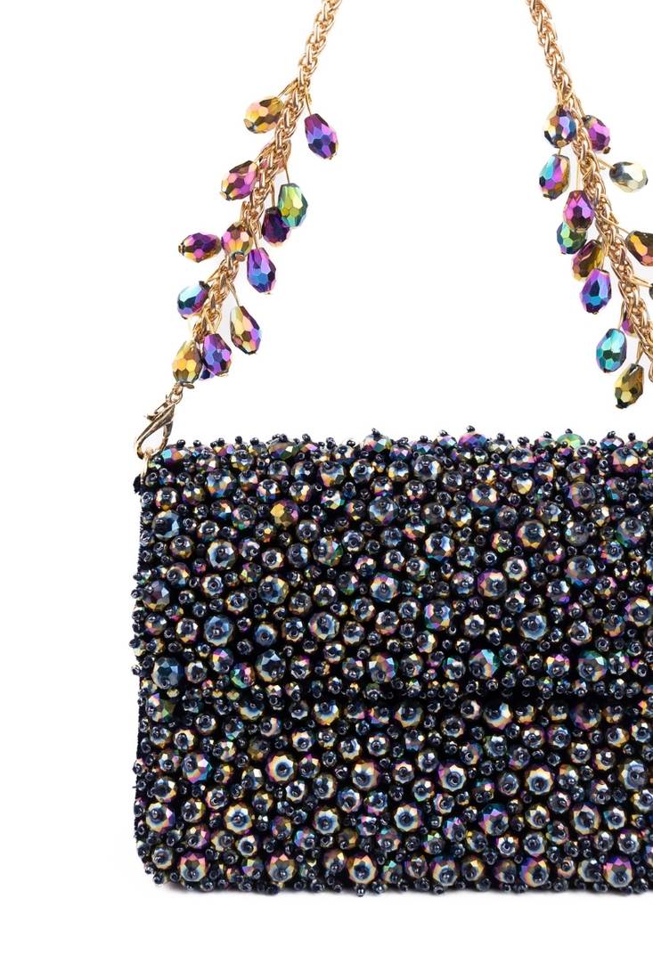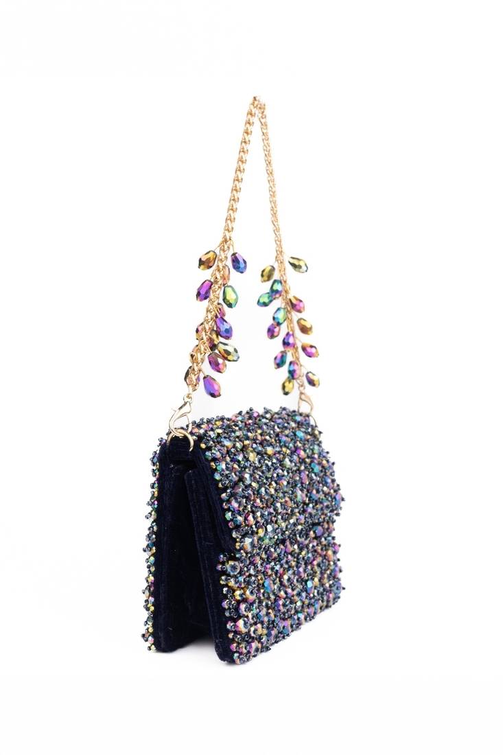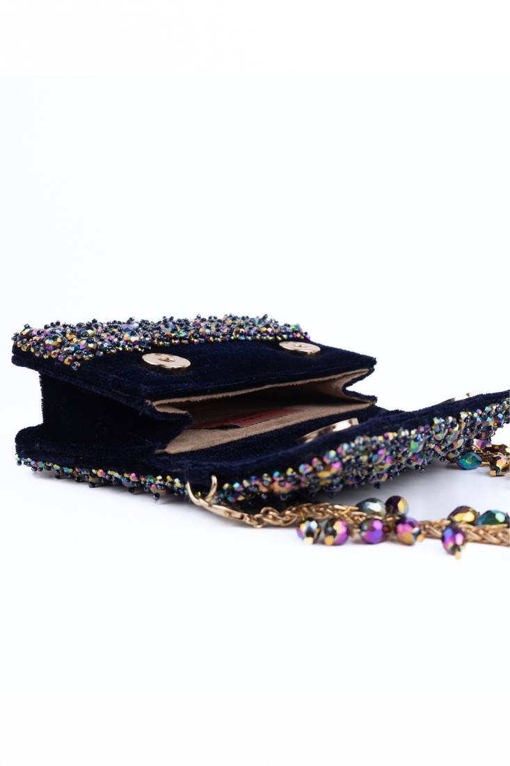 Our Kiyara Mutlicolour Suede Crystal Embellished Mini Clutch Bag Is A Beautifully Handcrafted Mini Clutch In Dark Purple And Metallic With Crystals Fully Embroidered On Bag's Front And Back Sides, Beautifully Crafted On A Dark Purple Suede Base. It Has A Magnetic Flap Closure And A Beautiful Short Metal Handle With Crystal Fallings, Representing A Playful Blend Of Modern And Contemporary Aesthetics. Designed To Carry Only Essentials, It Does Not Fit A Phone And Is Perfect For Cards, Cash, Keys, And Compact Makeup. The Embellished Strap Detail Enhances Its Couture Appeal, Making It Ideal For Festive Nights And Party Styling.