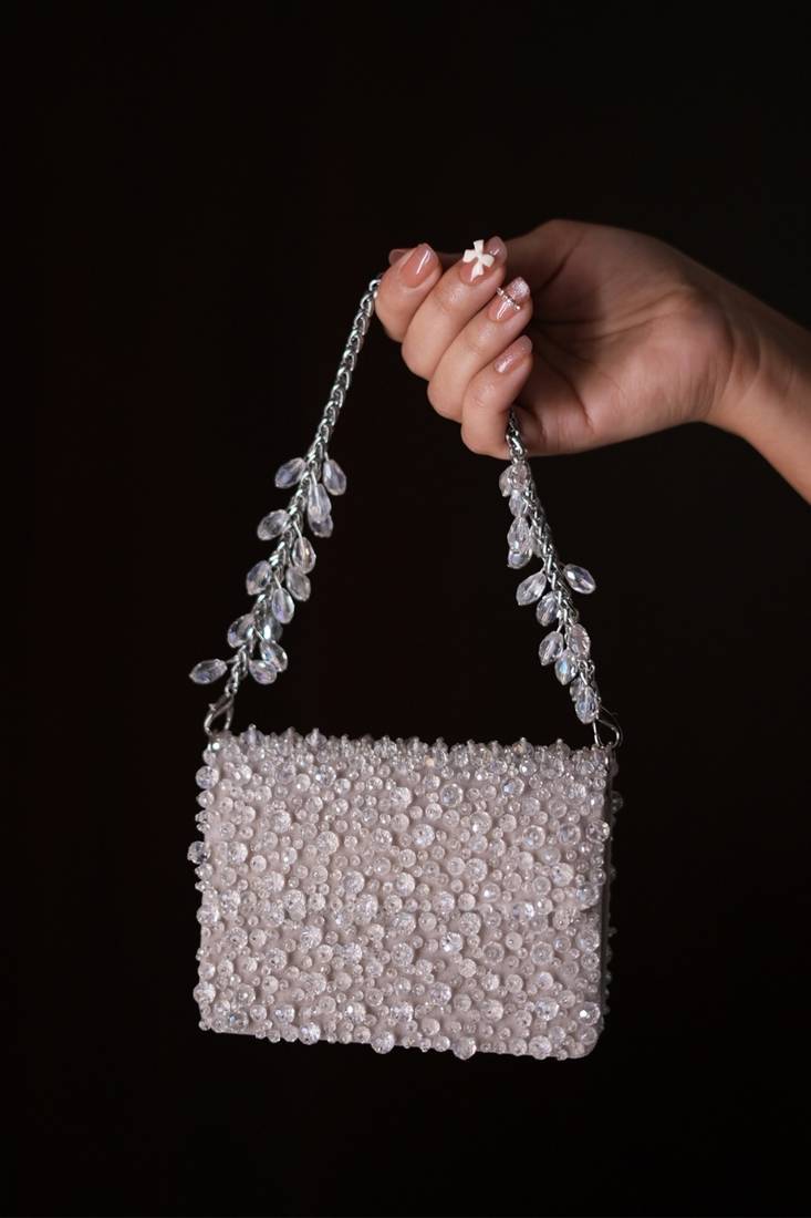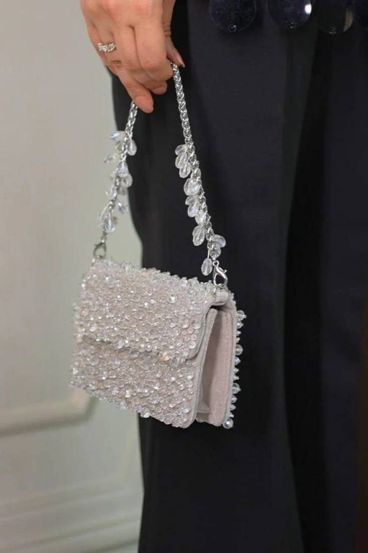 | Product Description | Our Kiyara Silver Suede Crystal Embellished Mini Clutch Bag Is A Beautifully Handcrafted Mini Clutch In Light Grey With Crystals Fully Embroidered On Bag's Front And Back Sides, Beautifully Crafted On A Suede Base. It Has A Magnetic Flap Closure And A Beautiful Short Metal Handle With Crystal Fallings, Representing A Playful Blend Of Modern And Contemporary Aesthetics. Product Colour May Slightly Vary Due To Photographic Lighting Sources Or Your Monitor Settings. |