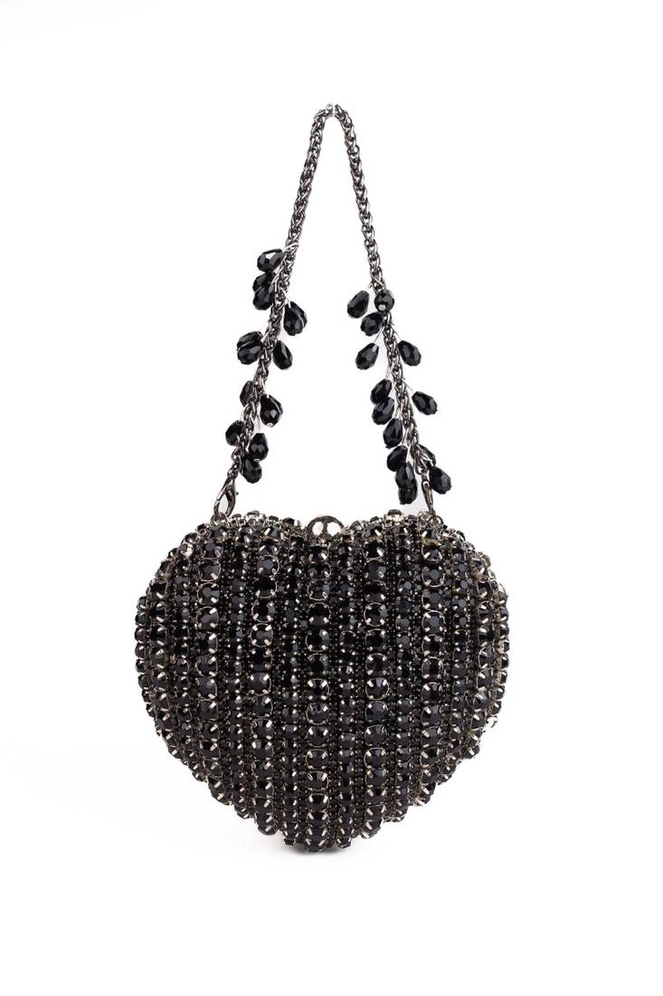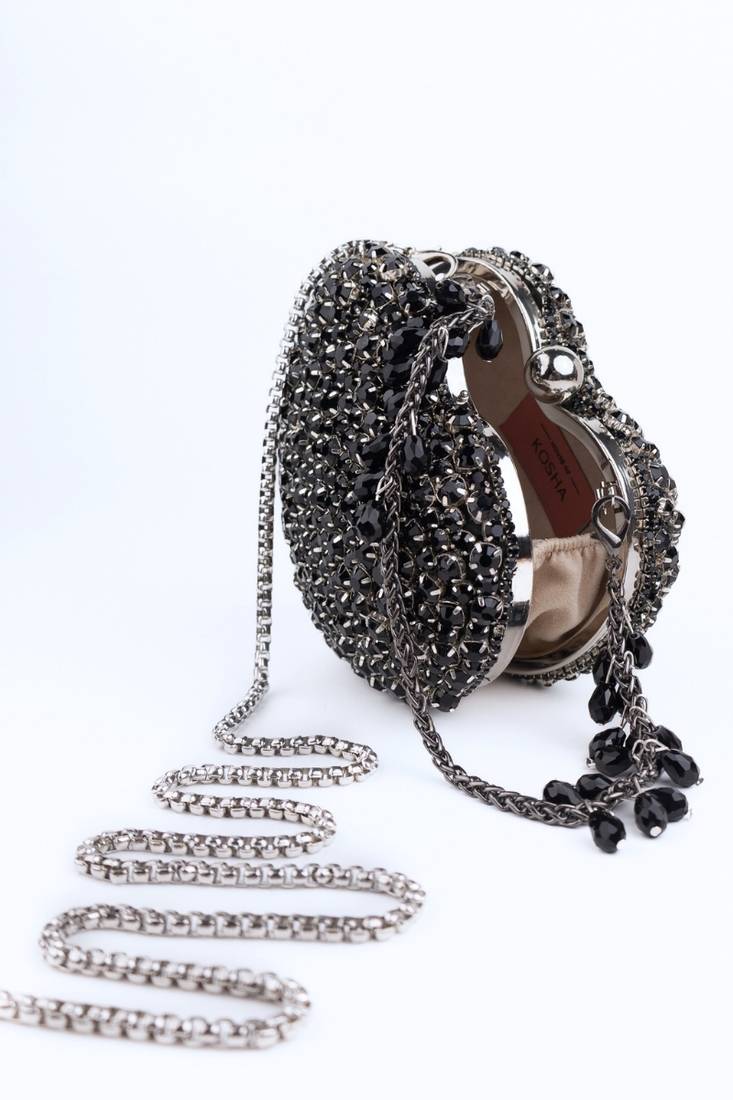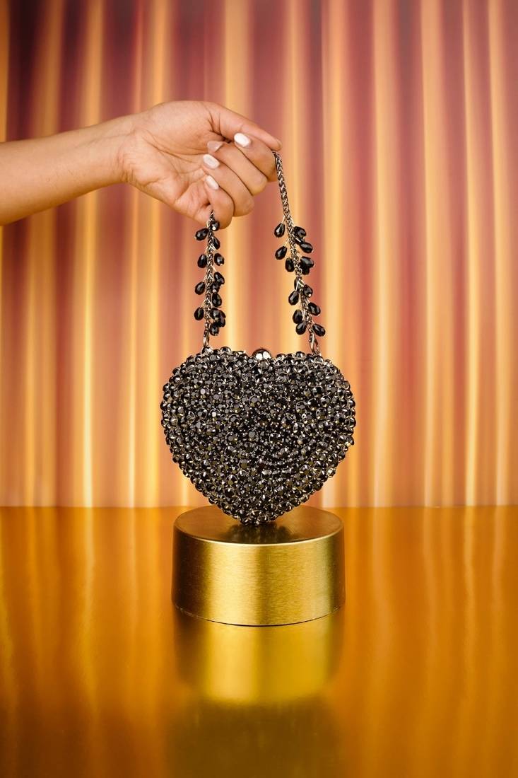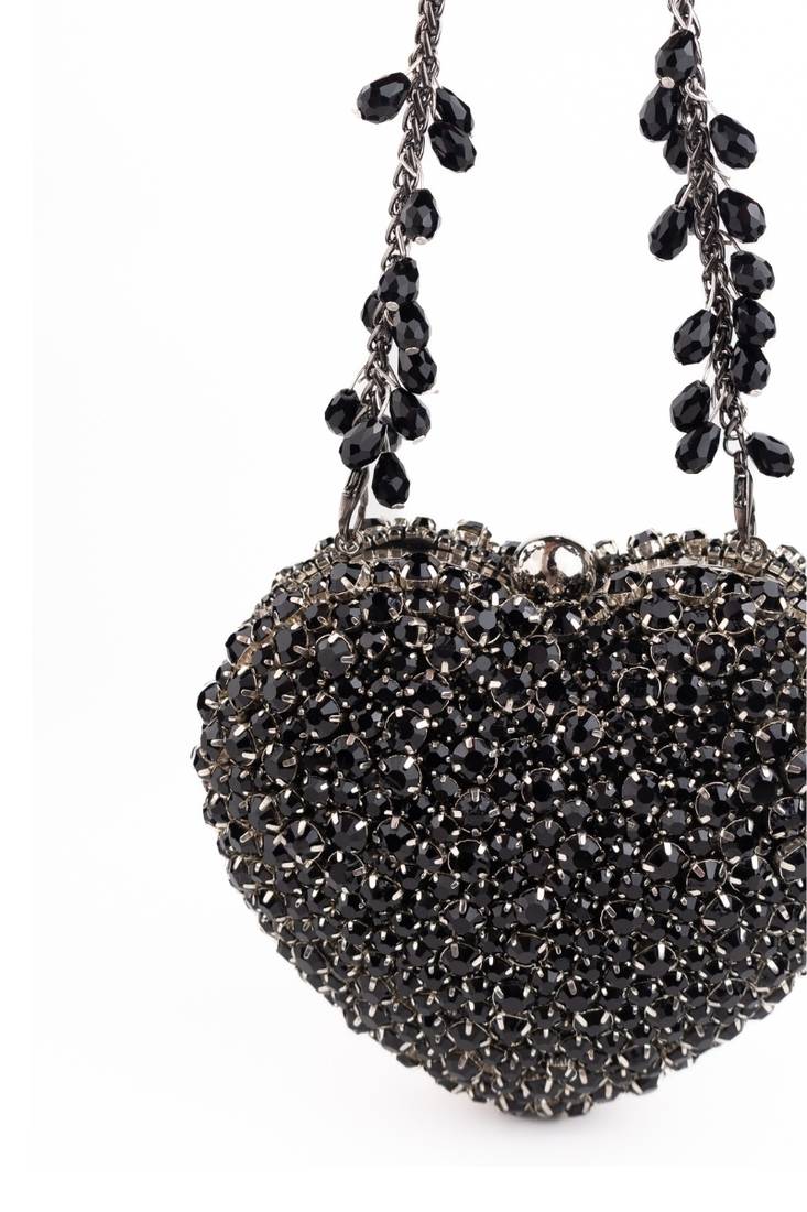 | Product Description | Bold, Powerful, And Endlessly Iconic — The Lola Black Suede Embellished Heart Bag Is The Ultimate Evening Statement. Crafted In Rich Black Suede And Fully Adorned With Dense Crystal Style Embellishments, This Heart Shaped Design Sparkles With Dramatic Intensity. The Sculpted Silhouette Adds Couture Appeal, Making It Perfect For Receptions, Parties, And High Glam Night Events. Designed To Carry Just The Essentials, This Compact Heart Bag Does Not Fit A Phone And Is Perfect For Cards, Cash, Keys, And Touch Up Makeup. The Structured Metal Kiss Lock Top Handle Clasp Adds Vintage Charm While Ensuring Secure Closure And Comfortable Carry.
