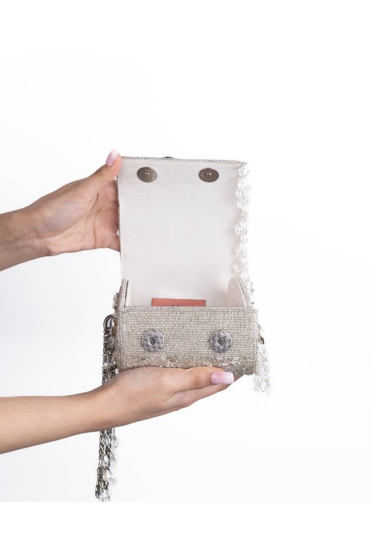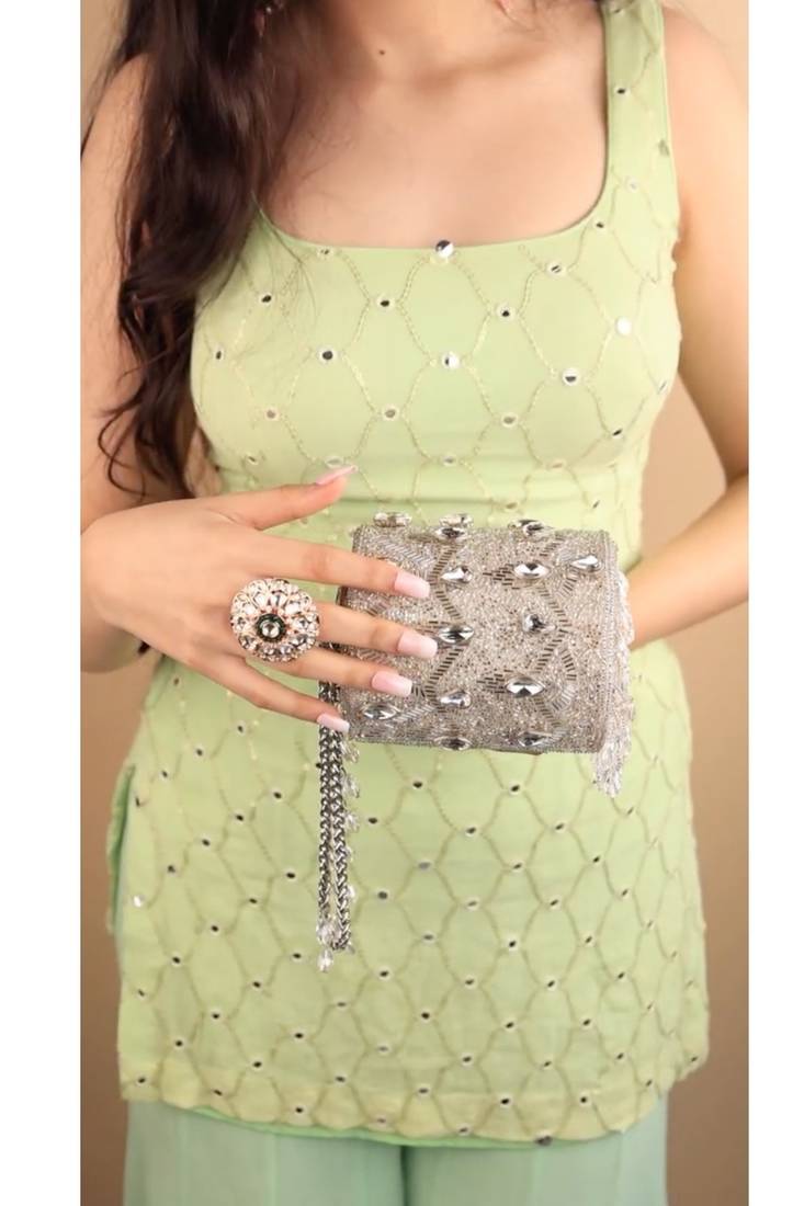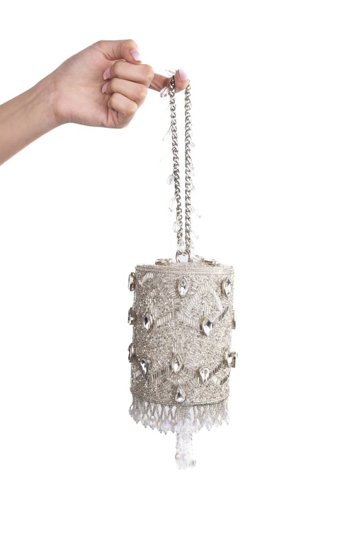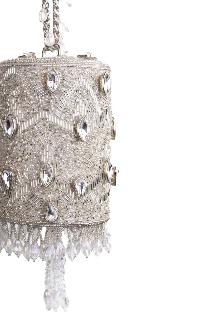 | Product Description | Our Rania Silver Georgette Embellished Cylinder Mini Bag Is A Radiant Silver Masterpiece, Crafted On A Soft Georgette Base And Adorned With Shimmering Silver Cutdana And Sparkling Rhinestones. The Intricate Embellishment Creates A Luxe, Light Catching Texture, While The Sleek Metal Handle—Accented With Crystal Beads—Adds A Refined Touch. Finished With A Crystal Latkan At The Base For Graceful Movement, This Compact Cylinder Bag Brings Effortless Glamour To Any Festive Or Evening Look. Product Colour May Slightly Vary Due To Photographic Lighting Sources Or Your Monitor Settings. |