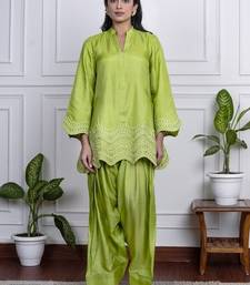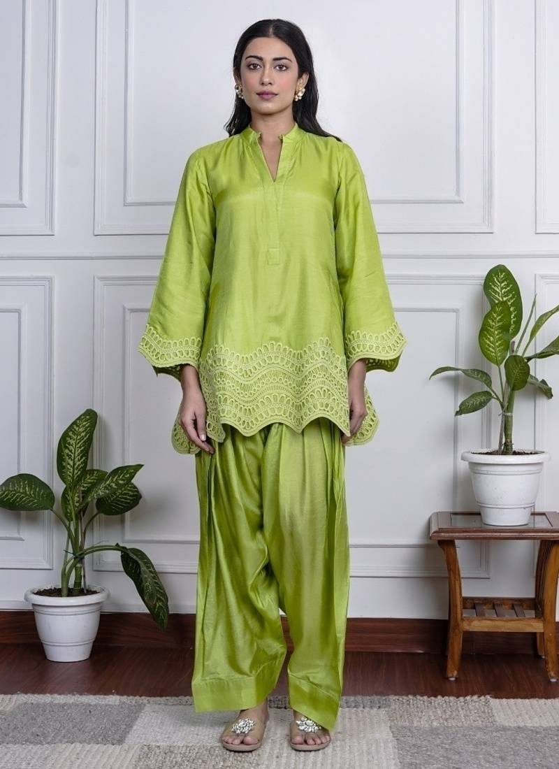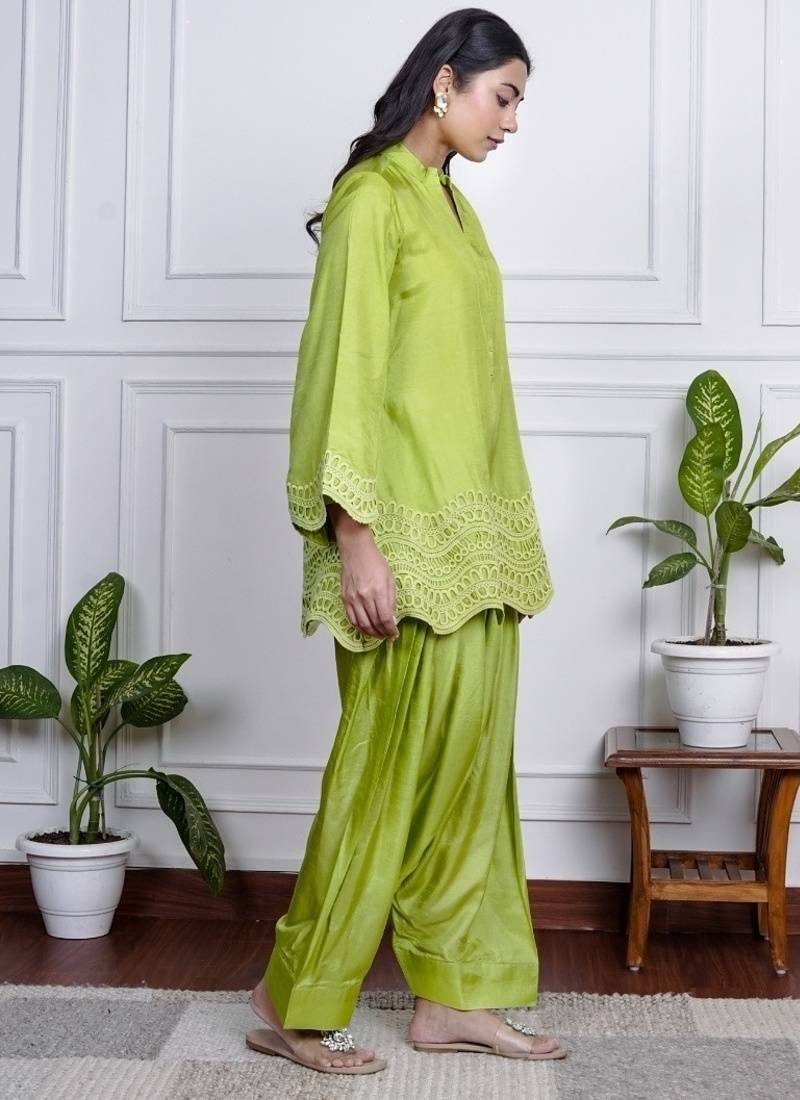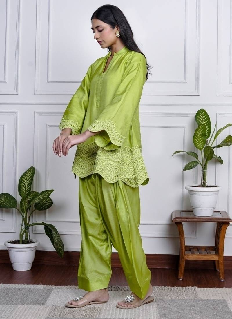 Product Description | Bold, Bright, And Unapologetically Festive This Lime Green Farsi Salwar Set Brings Together Playful Charm And Traditional Style. The Flowy Silhouette Of The Kurta And Wide Legged Salwar Makes It Ideal For Easy Movement And Standout Presence Fabric Dola Silk. |