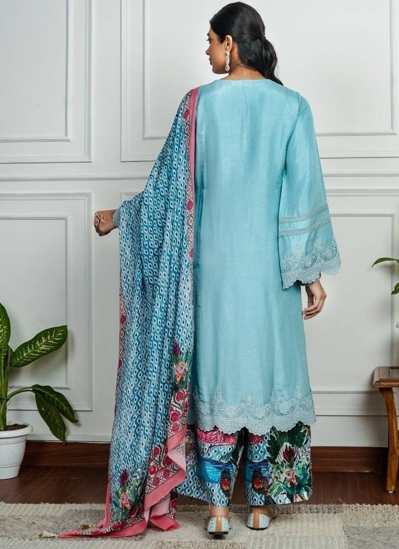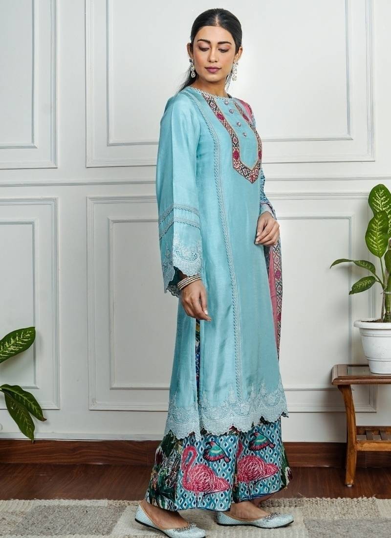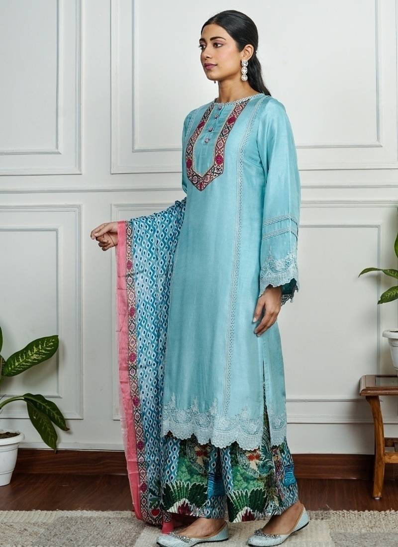 Product Description | A Refreshing 3 Piece Sky Blue Dola Silk Kurta Set With Intricate Thread Work Paired With Matching Pants And A Contrasting Coral Dupatta The Blend Of Cool And Warm Tones Adds Visual Interest, While The Relaxed Silhouette Keeps It Fuss Free And Festive. Fabric Sky Blue Dola Silk Printed Multicolour. |