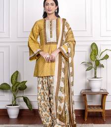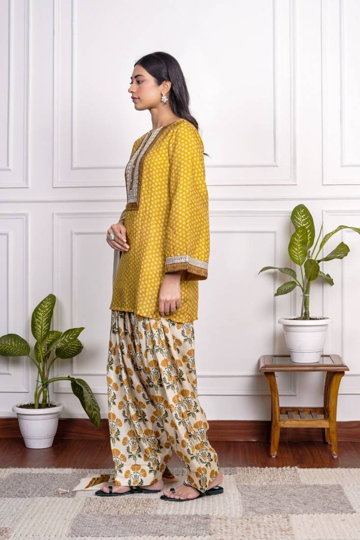 Product Description | This Mustard Yellow 3 Piece Farsi Salwar Set Is Full Of Festive Cheer. The Kurta Features Classic Block Prints With Mirror Detailing On The Yoke, Paired With A Printed Farsi Style Salwar And A Lightweight Dupatta To Match. It's Vibrant, Comfortable, And Rooted In Tradition Fabric Dola Silk. |