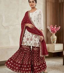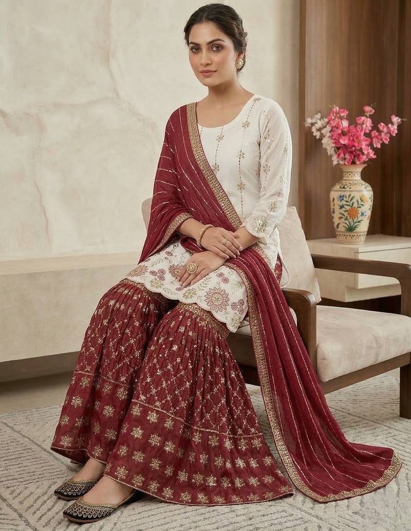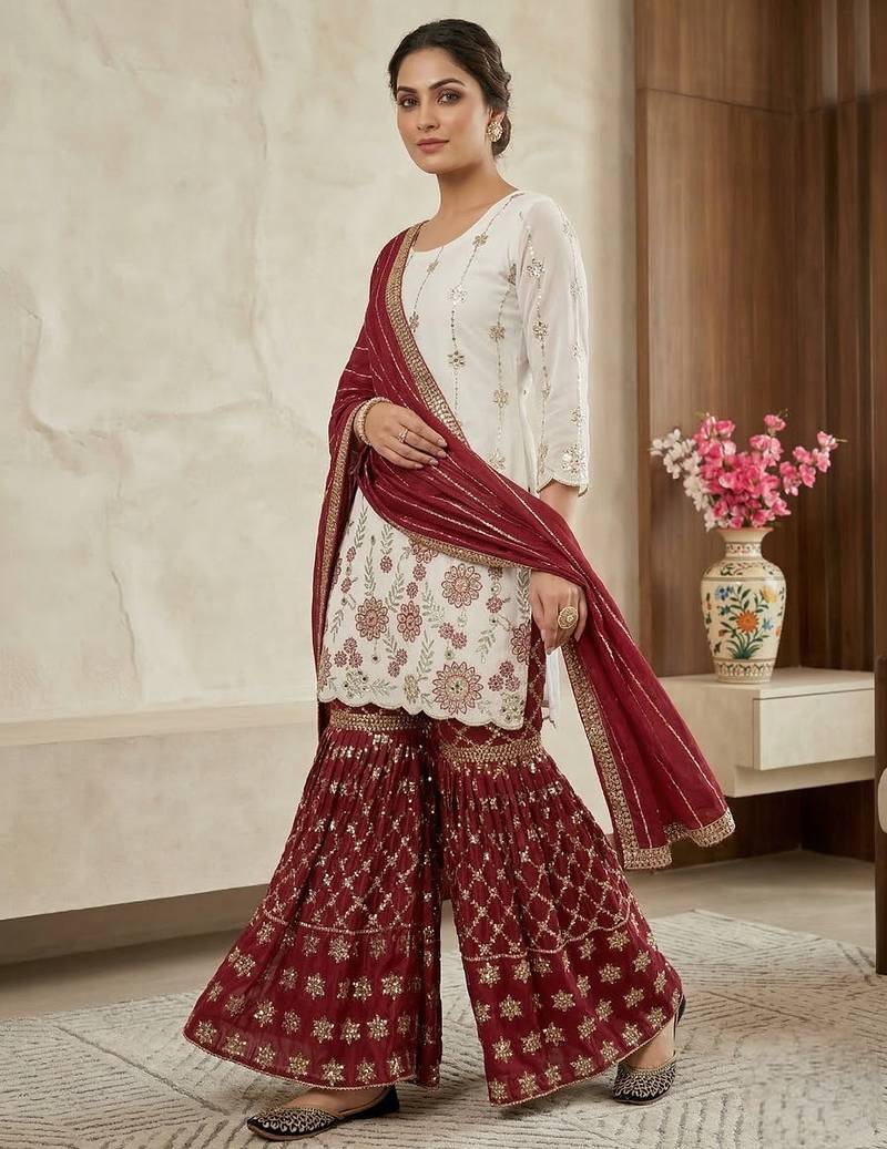 Heavy work white top with red sharara suit with dupatta stitched