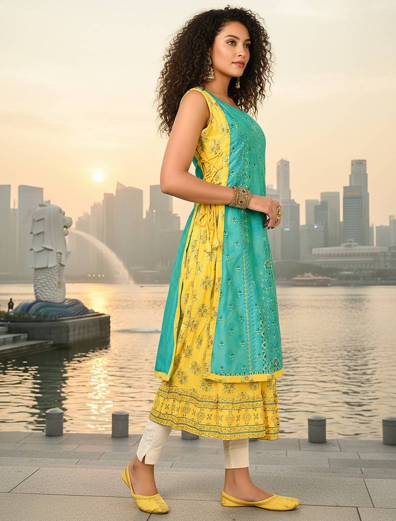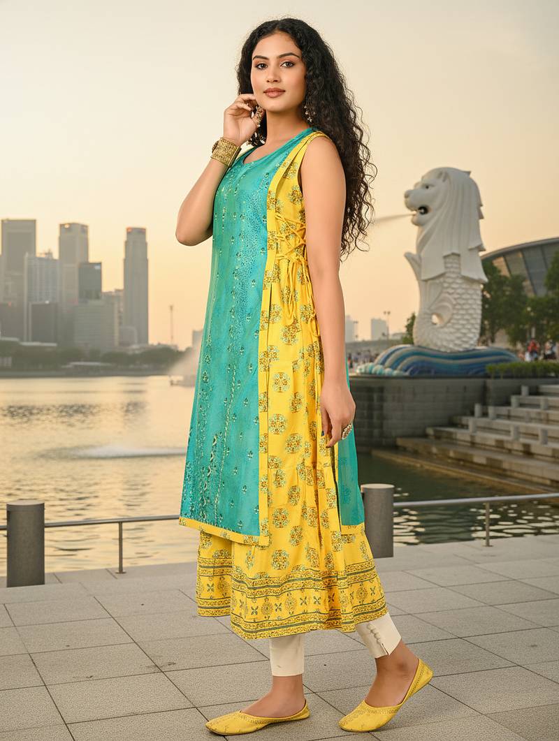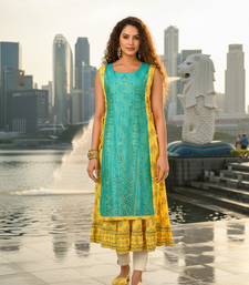 | Product Name | Derk Blue Cotton Inner With Chanderi Layered Jacket Kurti Set | |