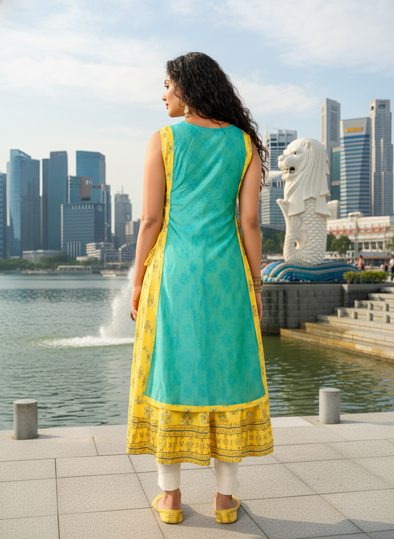 Derk blue cotton inner with chanderi layered jacket kurti set