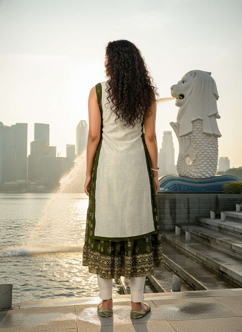 Derk green cotton inner with chanderi layered jacket kurti set