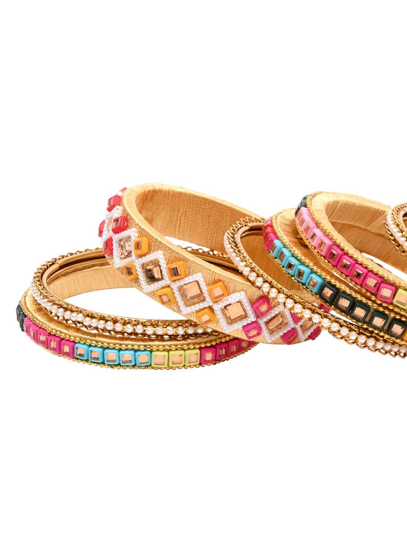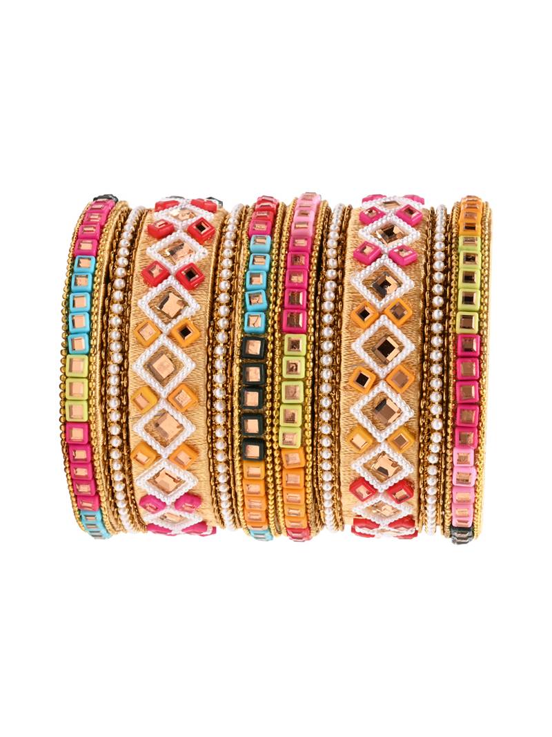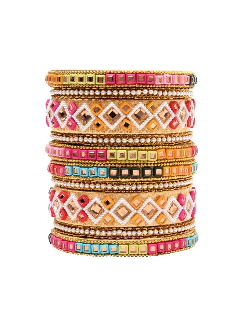 Gold Plated Traditional Silk Thread Handcrafted Vibrant Multicolor Embellished Bangles Chuda Bangle Set For Bridal
