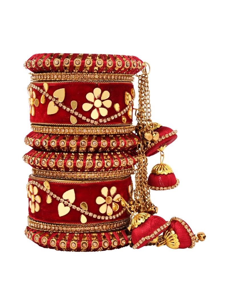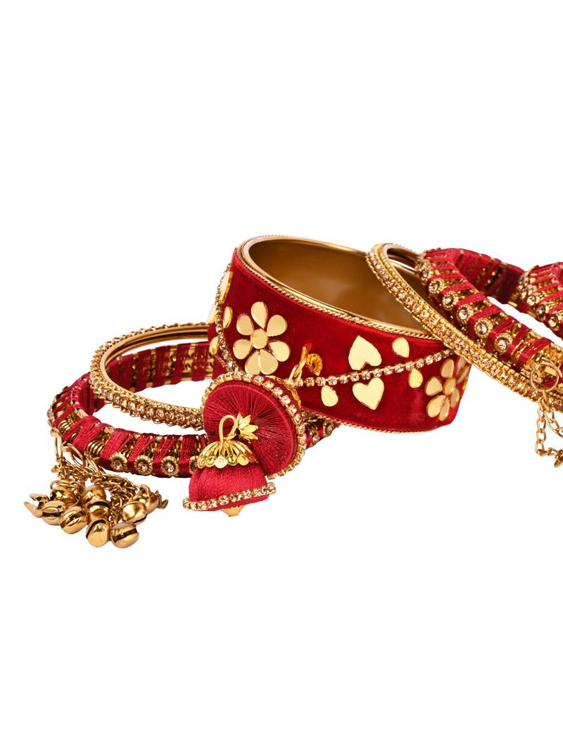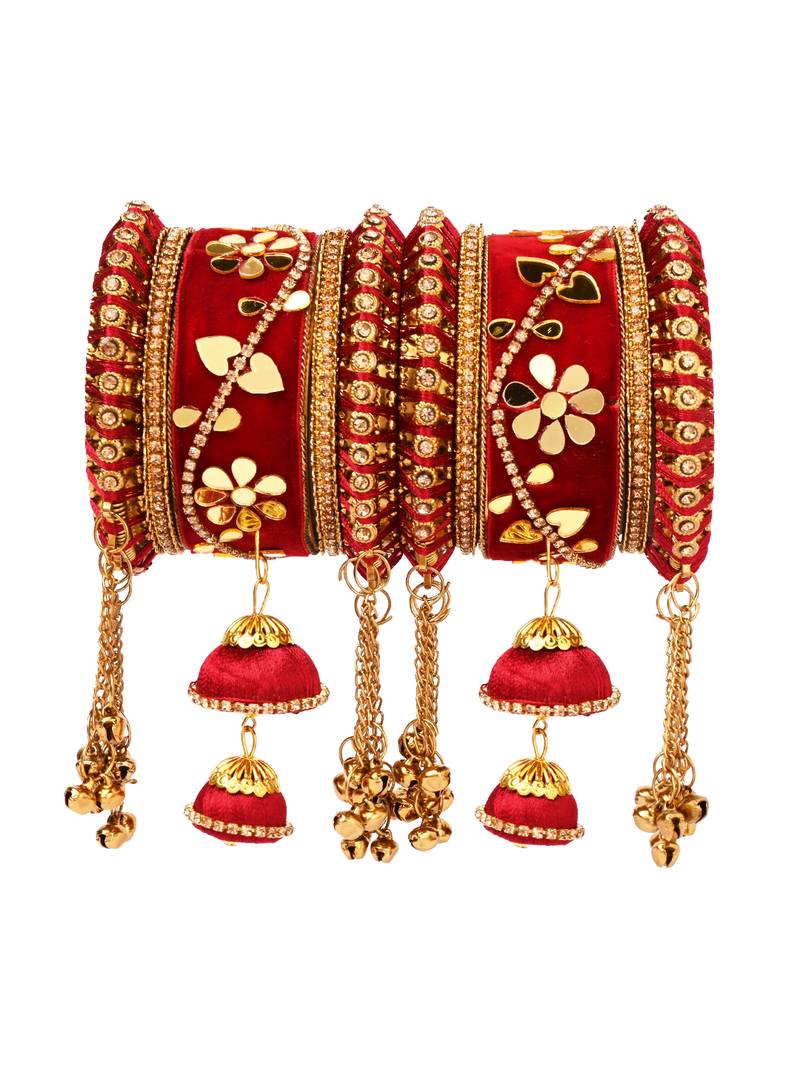 Gold Plated Traditional Velvet Matching Embellishments Work & Latkan Detailing Bangles Chuda Bangle Set For Bridal