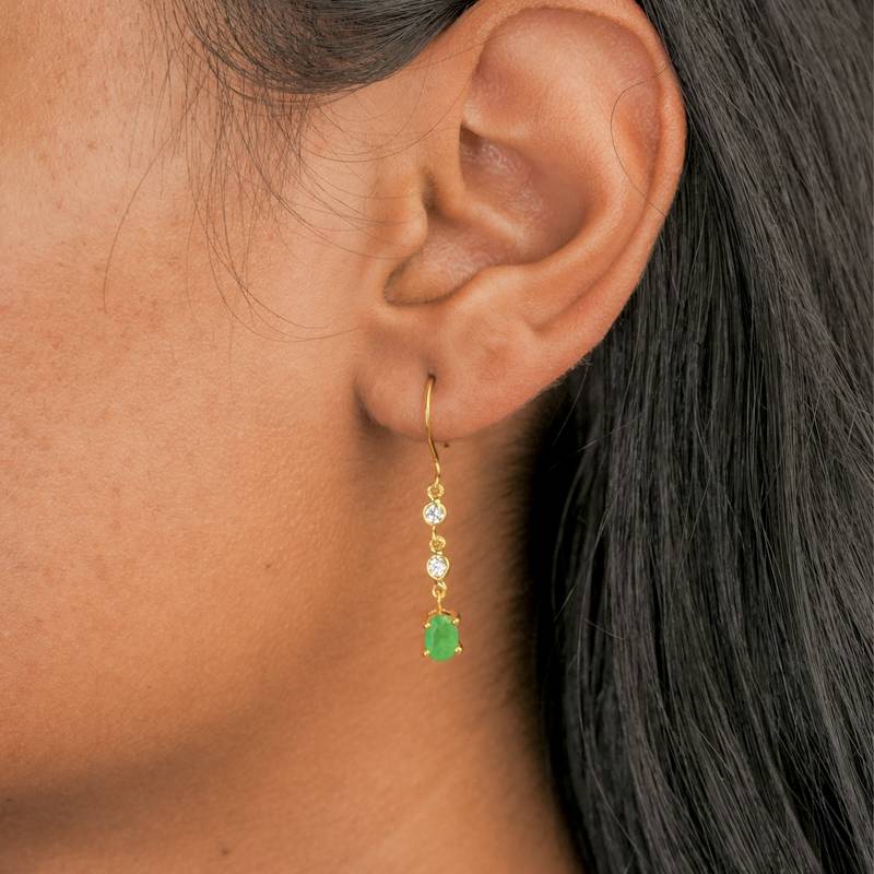 | Product Description | Delicate And Minimal, These Drop Earrings Feature Two Sparkling Cubic Zirconia Followed By A Single Oval Emerald (4 X 5.7 Mm), Each Stone Spaced 3.5 Mm Apart For Graceful Movement. Handcrafted In 925 Sterling Silver With 18 K Gold Plating And Finished With A Shepherd Hook, The Pair Combines Refined Simplicity With A Subtle Pop Of Color — Perfect For Everyday Elegance Or Layered Styling. |