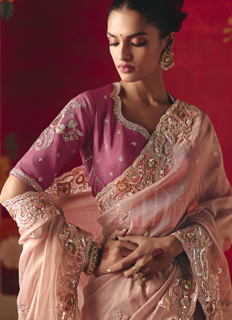 Baby pink fancy saree with sequins dhaga & thread embroidered butti and designer blouse