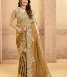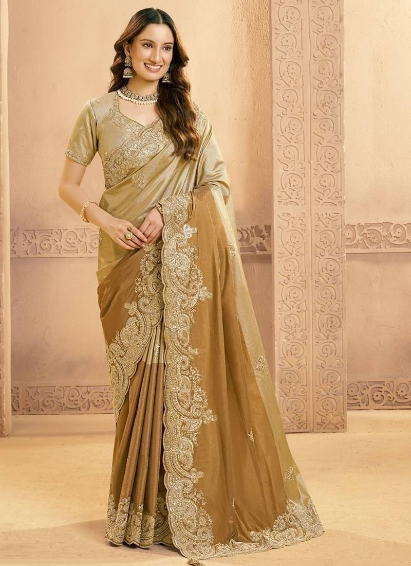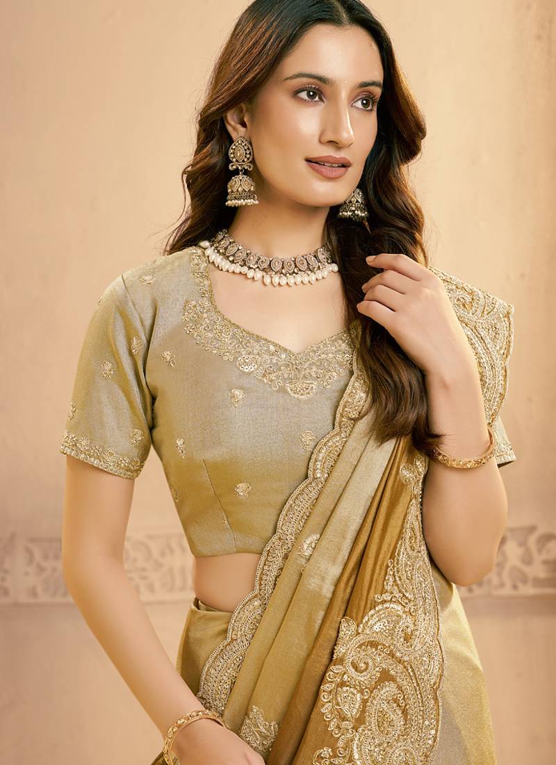 Beige & antique gold kora zari silk blend sequince with beads work designer saree