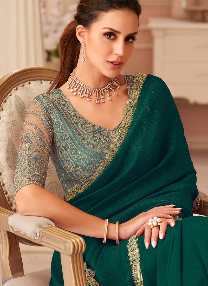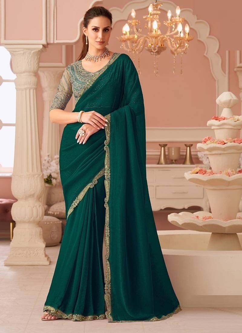 Dark green georgette sequince & cut work border heavy designer blouse party wear saree
