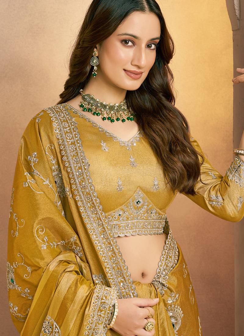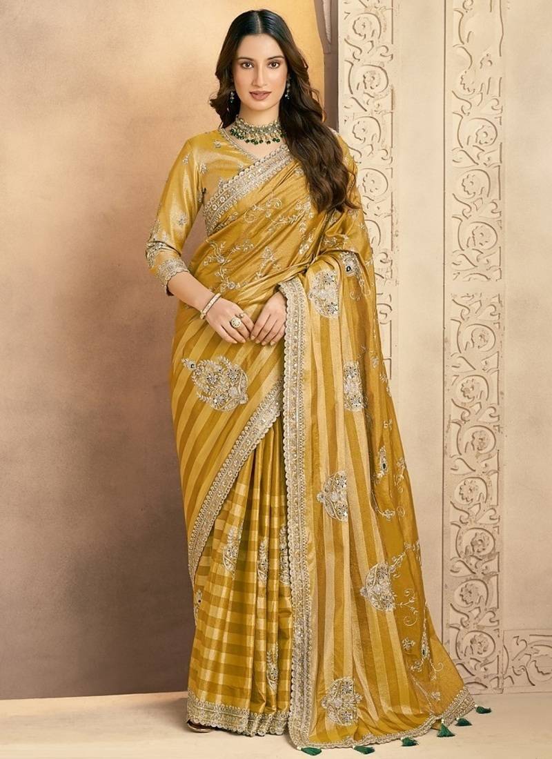 Golden kanjivaram zari silk blend sequince & aari work with stone designer saree