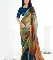 Multicolour two tone satin silk digital printed embroidery hand work saree