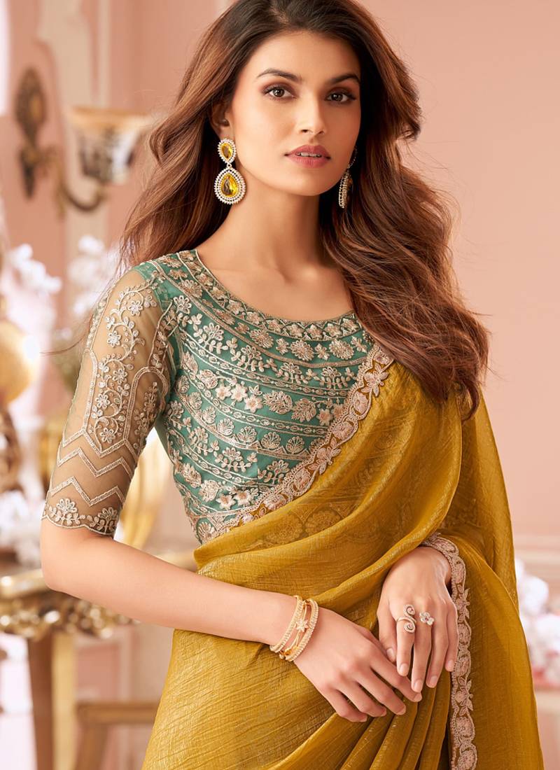 Product Name | Mustard Georgette Resham & Cut Work Border Heavy Designer Blouse Party Wear Saree | |
