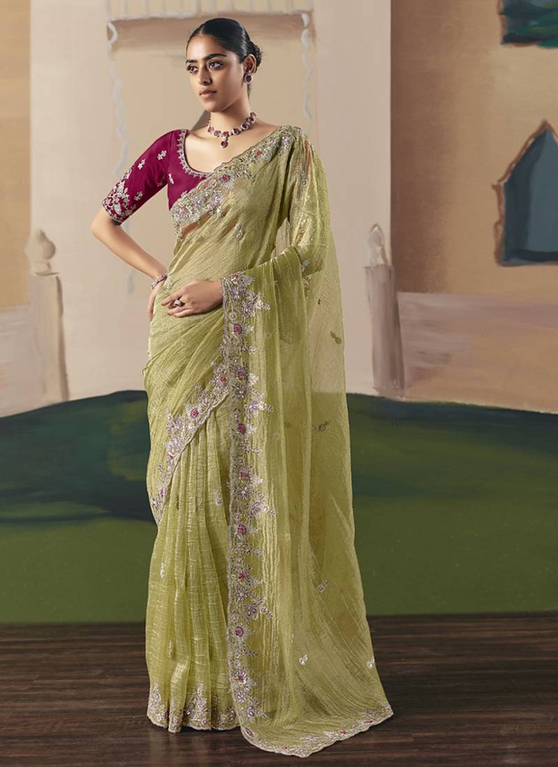 Product Name | Olive Tissue Silk Sequince & Resham Work Cut Work Border Heavy Designer Saree | |