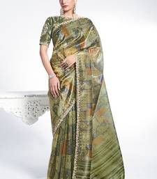 Olive two tone paper silk digital print with embroidery hand work wear saree