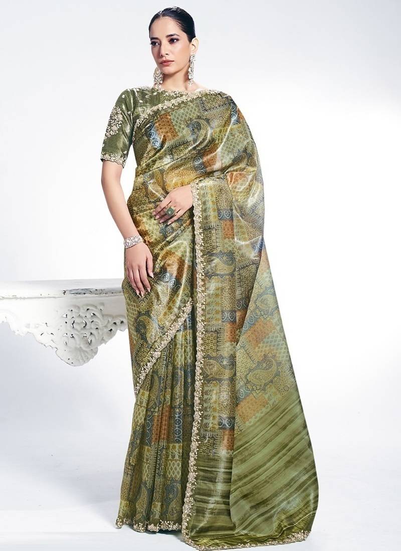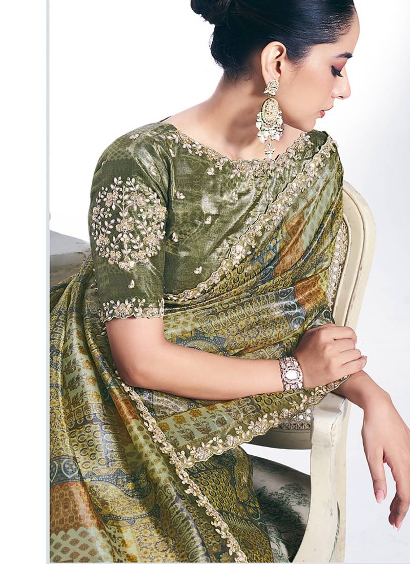 Product Name | Olive Two Tone Paper Silk Digital Print With Embroidery Hand Work Wear Saree | |