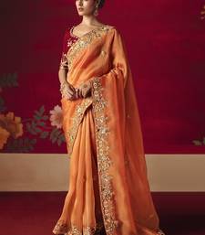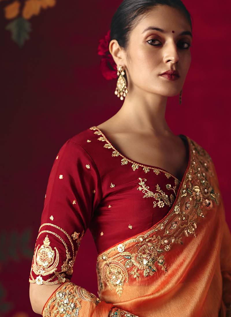 Orange fancy saree with sequins dhaga & thread embroidered butti and designer blouse