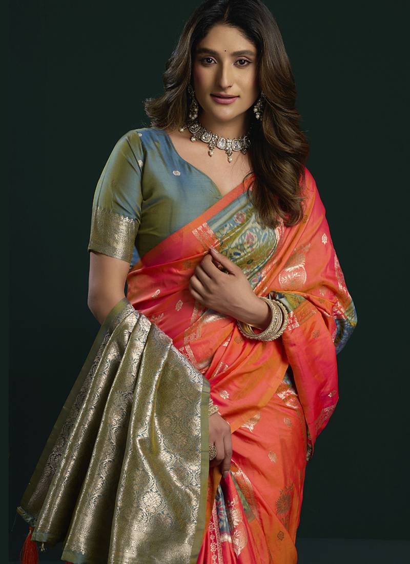 | Product Name | Orange & Olive Soft Silk With Fancy Pumpum Saree | |