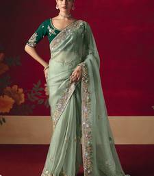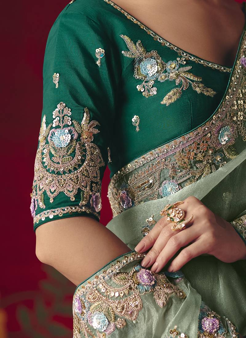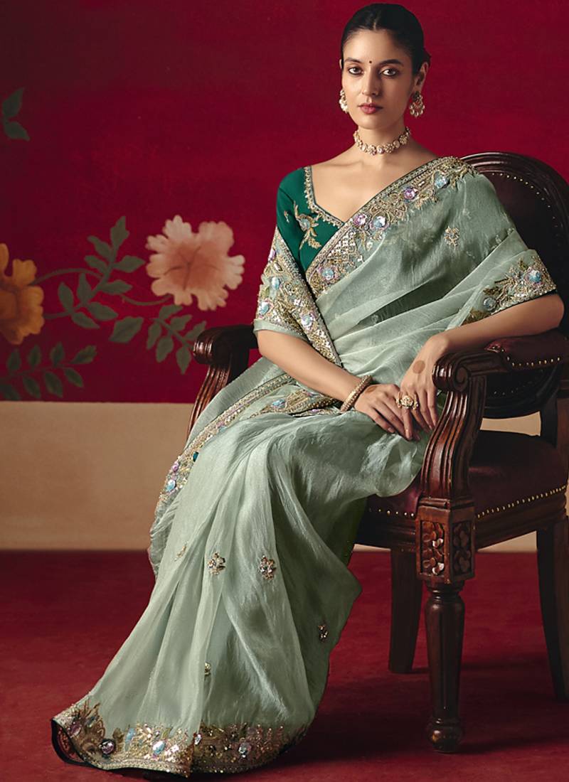 Pista fancy saree with sequins dhaga & thread embroidered butti and designer blouse
