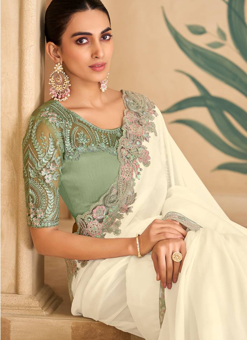 Powder white silk georgette saree & banglori work blouse